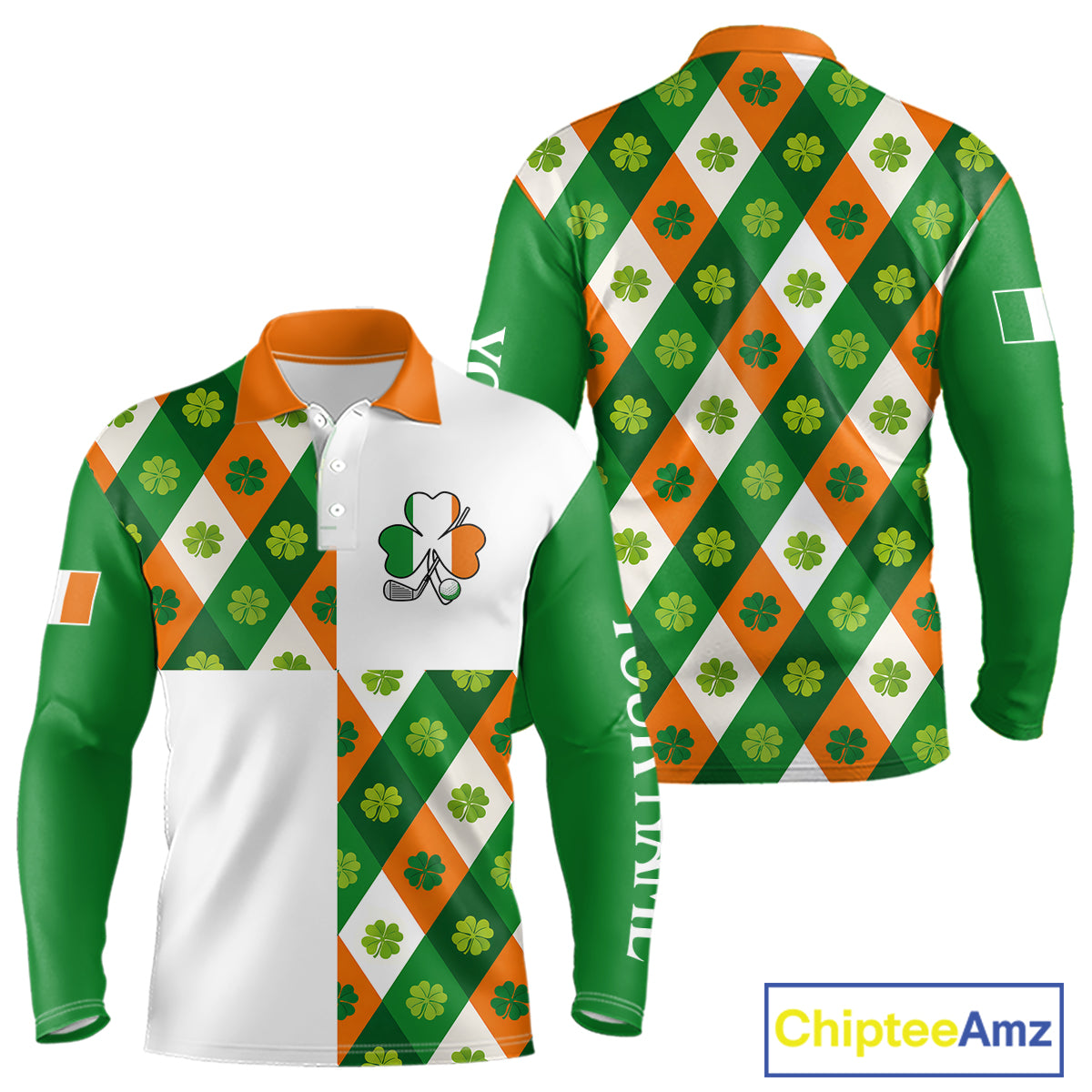 Argyle Long Sleeve Golf Polo Shirt Custom Ireland Flag St Patricks Day Green Clovers Plaid Golf Top NHN0141