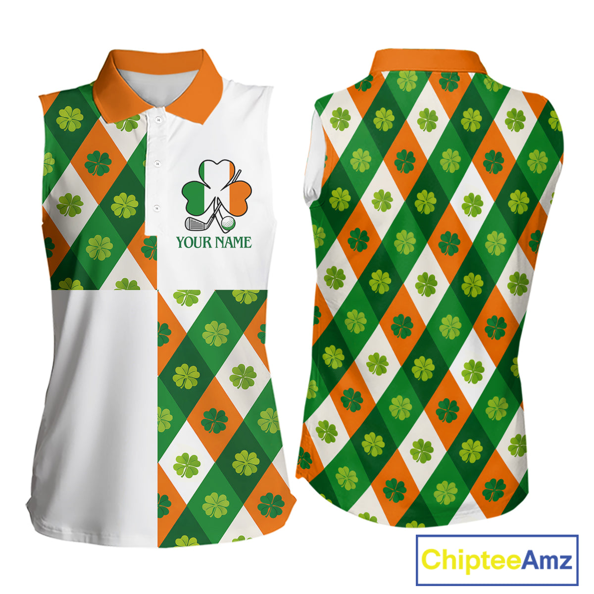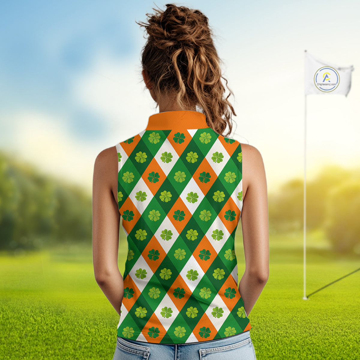 Argyle Womens Sleeveless Golf Polo Shirt Custom Ireland Flag St Patricks Day Green Clovers Plaid Golf Top NHN0141