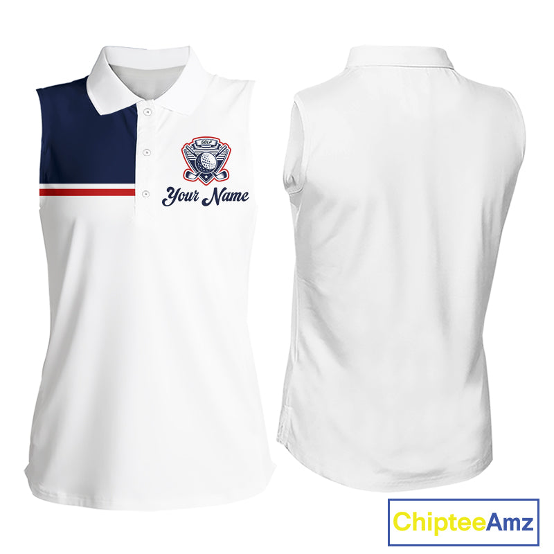 Blue And White Golf Polo Shirt, Custom Name Womens Sleeveless Golf Polo Shirt, Personalized Golf Gifts NHN0117