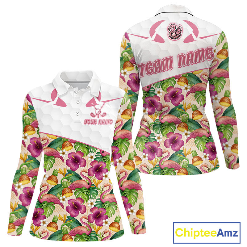Funny Flamingo Womens Long Sleeve Golf Polo Shirt Floral Tropical Custom Pink Golf Shirts Golfer Gift NHN0107