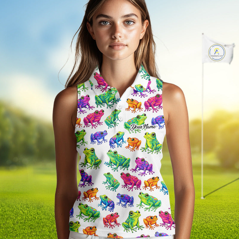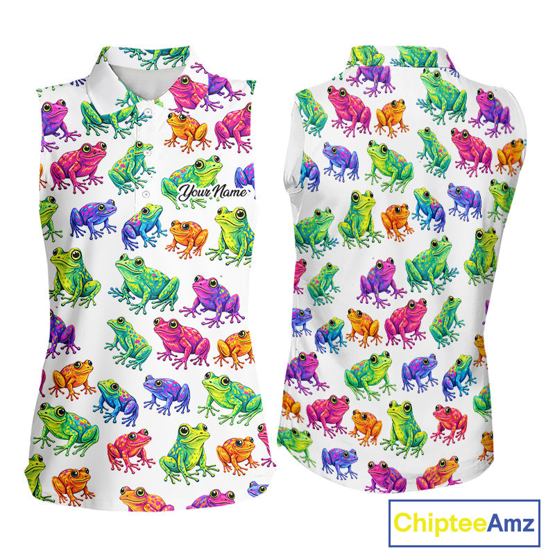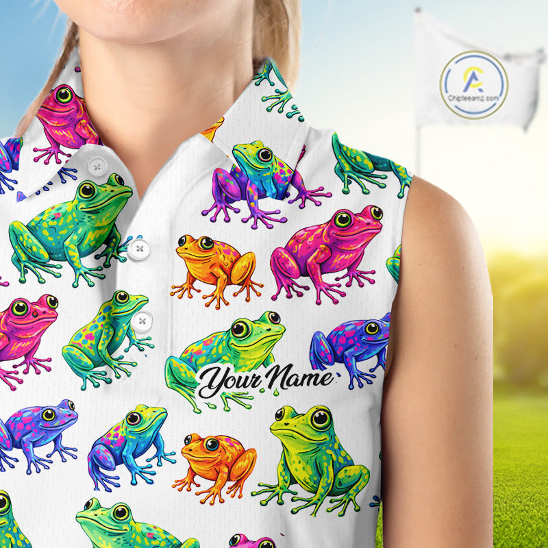 Funny Watercolor Womens Sleeveless Golf Polo Shirt Custom Colorful Frog Pattern Golf Attire NHN0134