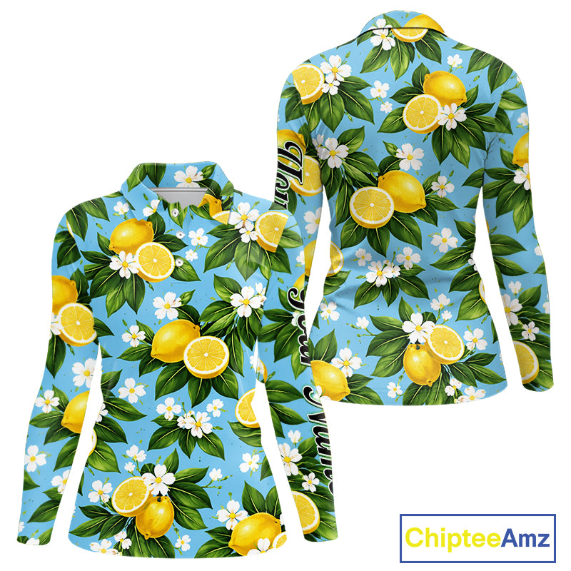 Funny Womens Long Sleeve Golf Polo Shirt Custom Blue Lemon Tree Pattern Golf Top, Golf Gifts NHN0142