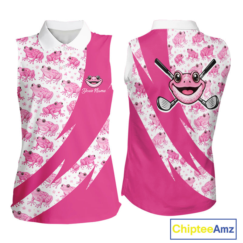 Funny Womens Sleeveless Golf Polo Shirt Custom Pink Frog Pattern Golf Attire For Ladies Golfer Gifts NHN0136