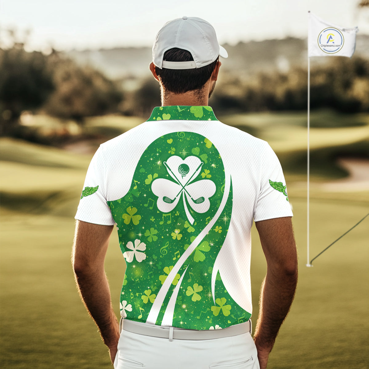 Mens Golf Polo Shirt Custom Name Green Music Angel Wing Golf Ball St Patrick’S Day Golf Outfit NHN0133