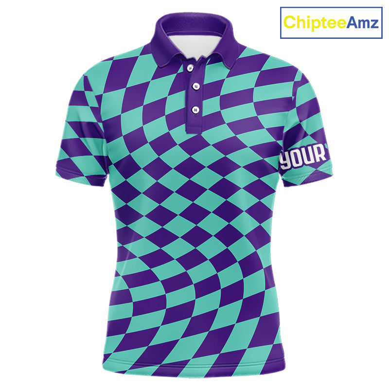 Plaid Mens Golf Polo Shirt Custom Purple & Blue Checkerboard Argyle Pattern Golf Shirts For Men NHN0129
