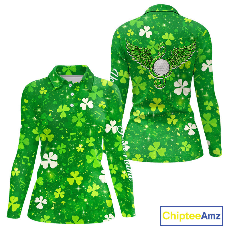 Womens Long Sleeve Golf Polo Shirt Custom Green Music Angel Wing Golf Ball St Patricks Day Golf Shirts NHN0132