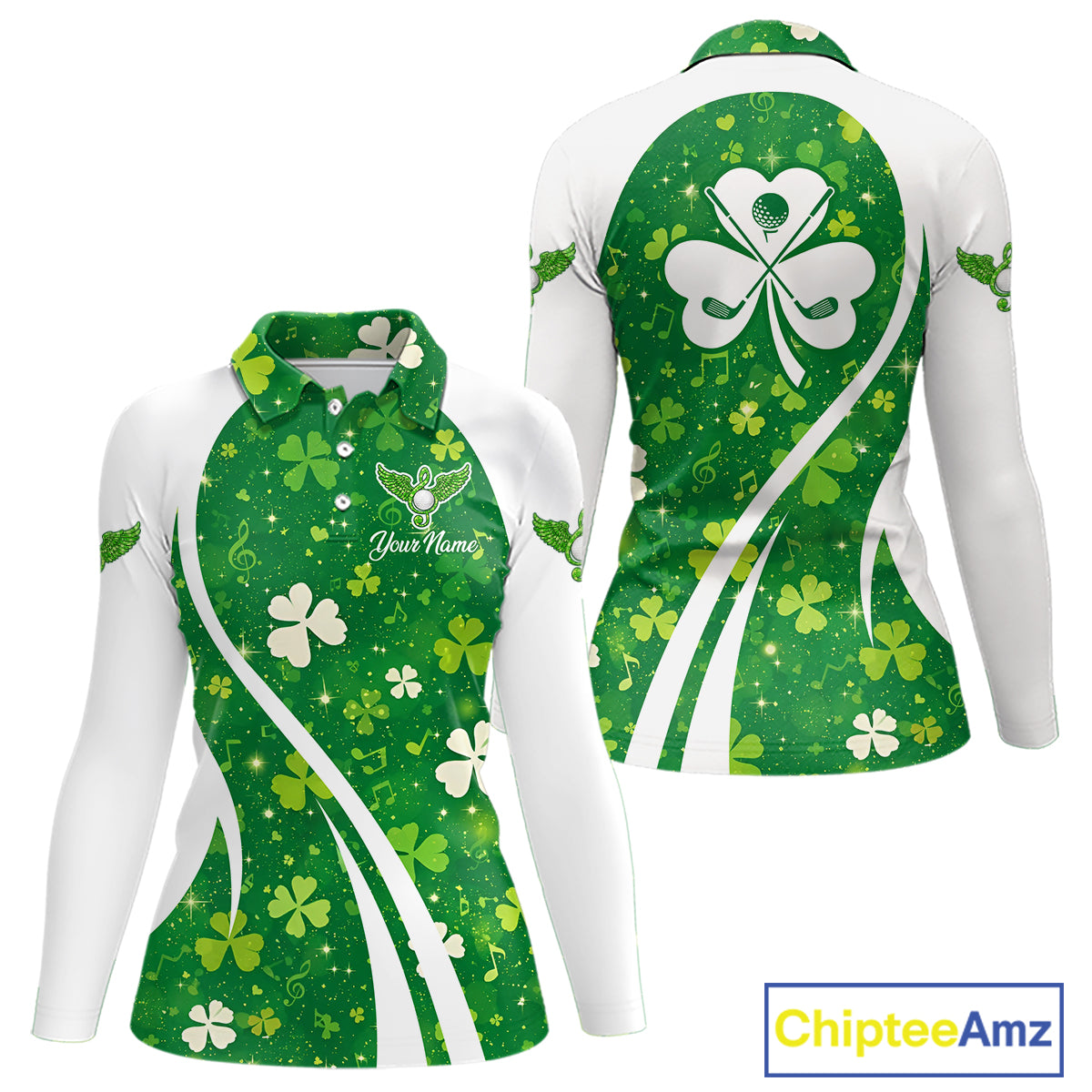 Womens Long Sleeve Golf Polo Shirt Custom Name Green Music Angel Wing Golf Ball St Patrick’S Day Shirt NHN0133