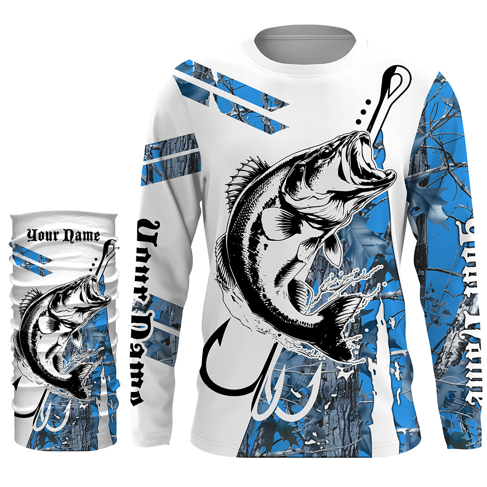 Fish Hook Bass Fishing Blue Camo Custom Long Sleeve Shirts, Personalized Bass Fishing Jerseys TTN112
