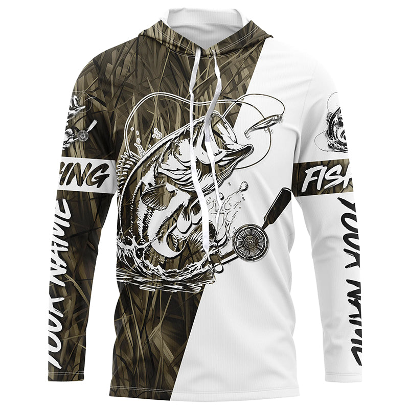 Custom Bass Fishing Tattoo Grass Camo Long Sleeve Tournament Fishing Shirts, Bass Fishing Jerseys IPHW6077