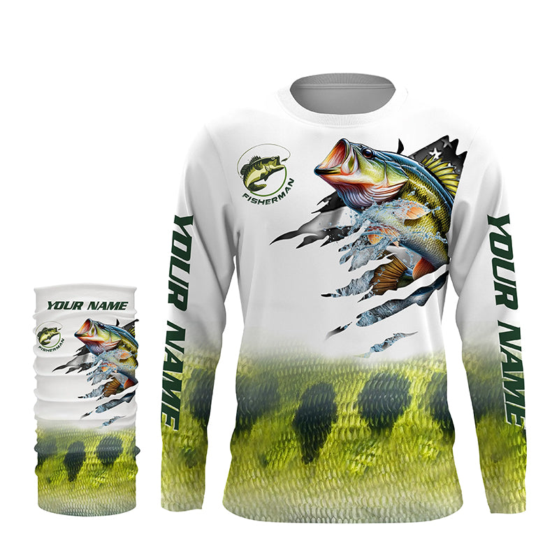Largemouth bass fishing green scale American flag patriot Customize name long sleeves UV fishing shirt NQS1855