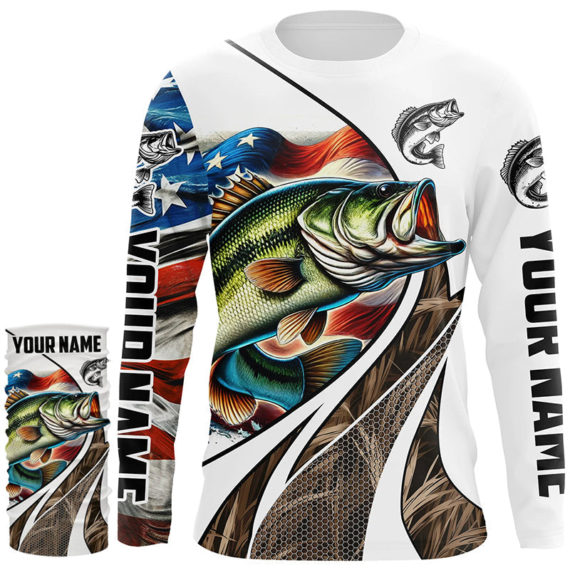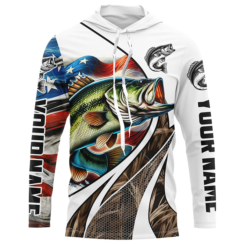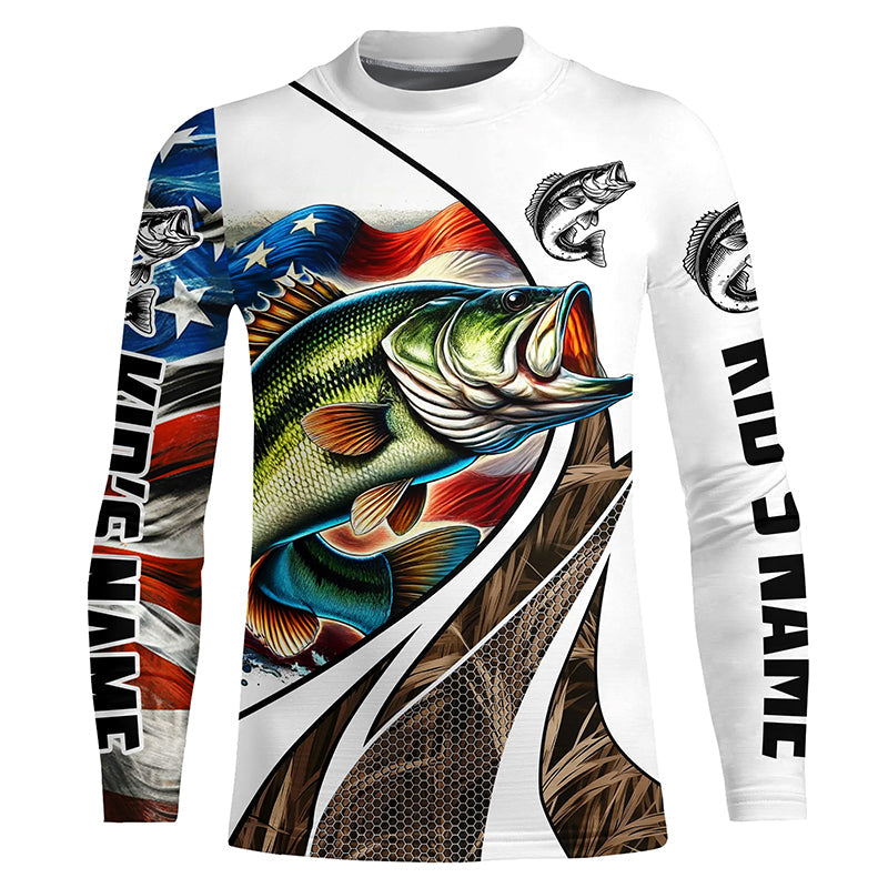 Personalized Largemouth Bass American flag Camo Fishing Jerseys, Custom Patriotic Bass Fishing Shirts NQS7870