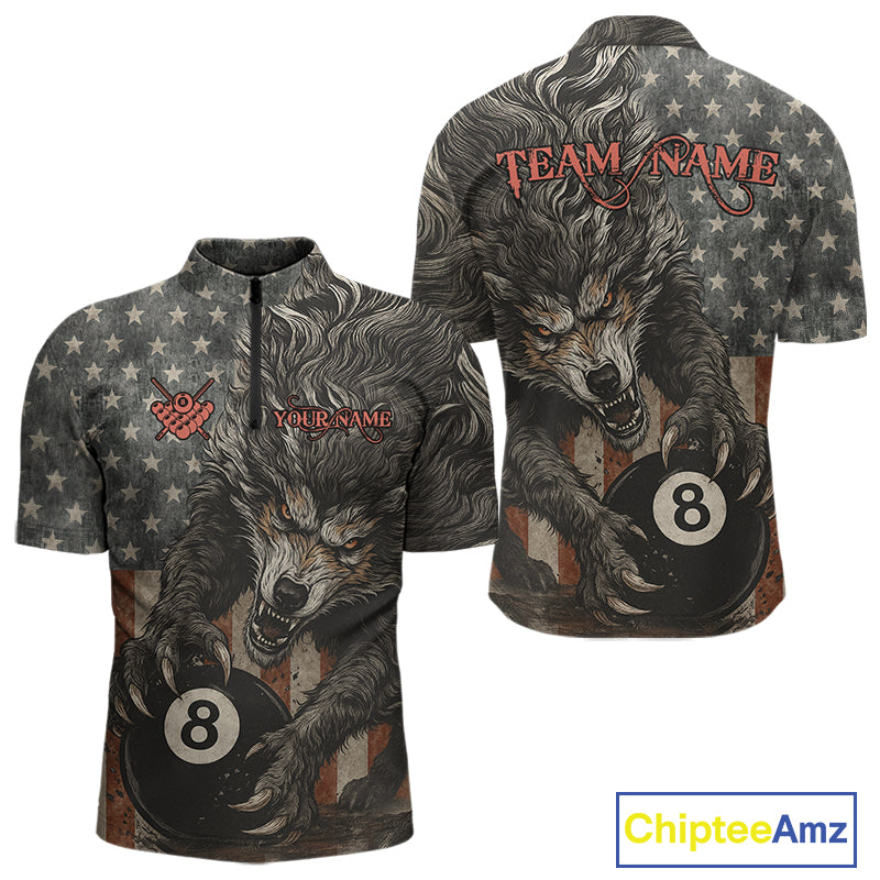 Personalized Vintage American Flag Wolf Billiard Shirt For Men, 8 Ball Pool Billiard Team Jerseys TDM4242