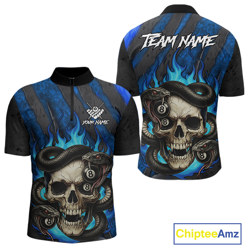Personalized Skull And Snakes Flame Billiard Shirt For Men Custom 8 Ball Pool Team Jersey |Blue TDM5085
