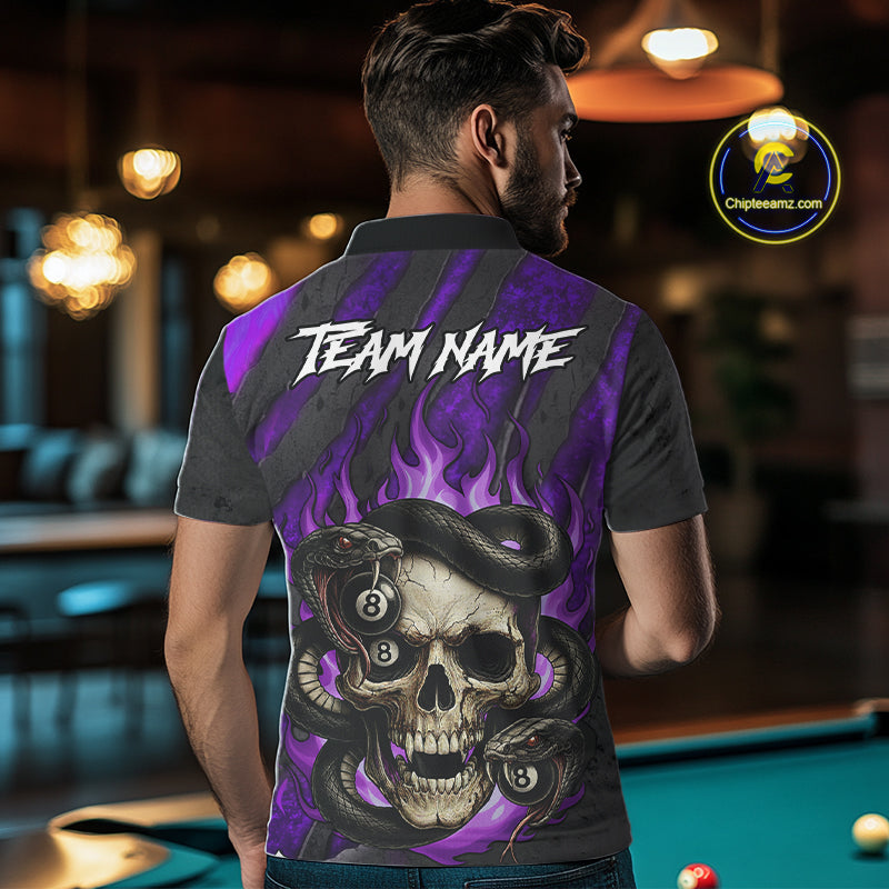 Personalized Skull And Snakes Flame Billiard Shirt For Men Custom 8 Ball Pool Team Jersey |Purple TDM5086