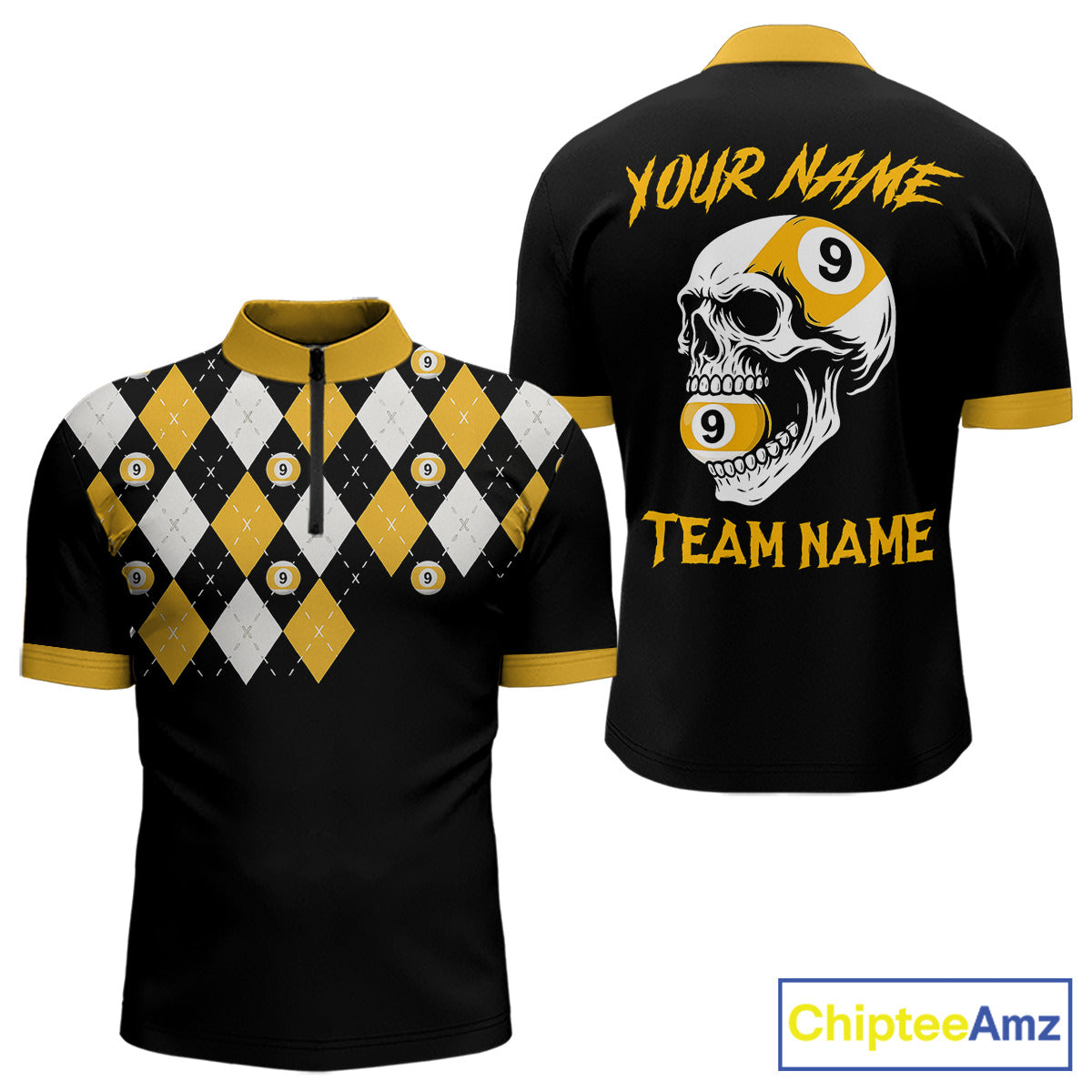 Personalized 9 Ball Skull Argyle Pattern Men's Billiard Shirts, 9 Ball Team Shirts Billiard Jersey TDM5137