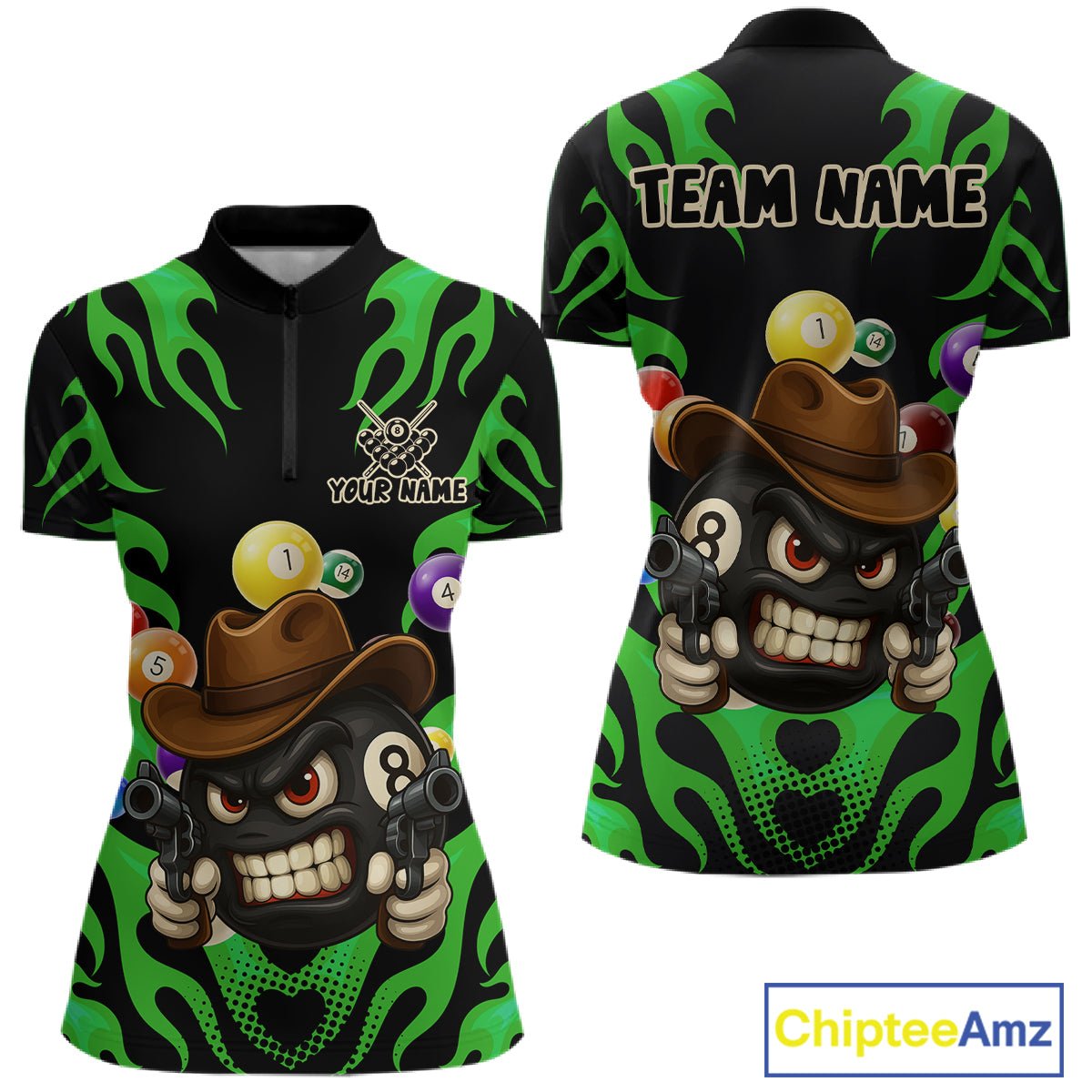 Personalized Green Funny Flame 8 Ball Billiard Shirt For Women Custom Pool Team Jersey Polo, 1/4 Zip TDM4985