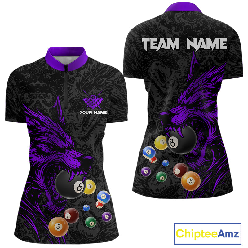 Personalized Wolf Billiard Balls Pool Shirt For Women, Black And Purple Billiard League Team Jersey TDM5203