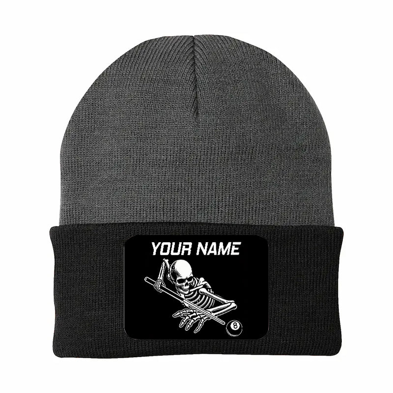 Personalized Skull 8 Ball Billiard Knit Beanie Hat With Rectangle Patch Custom Billiard Knit Cap TDM4940