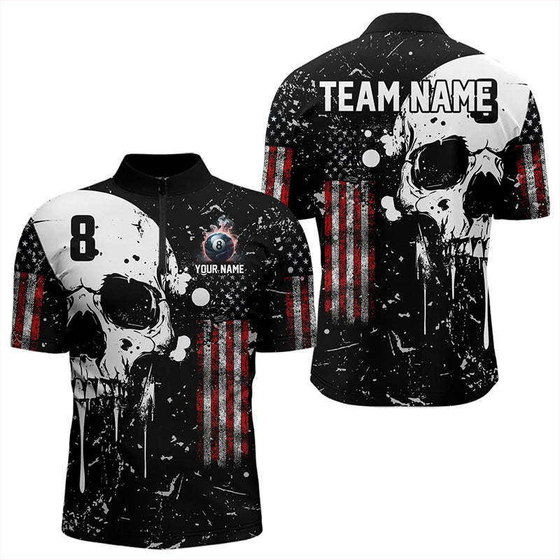 Black Grunge Skull American Flag Men Billiard Polo, Quarter Zip Custom Patriotic Billiard Jersey TDM3232
