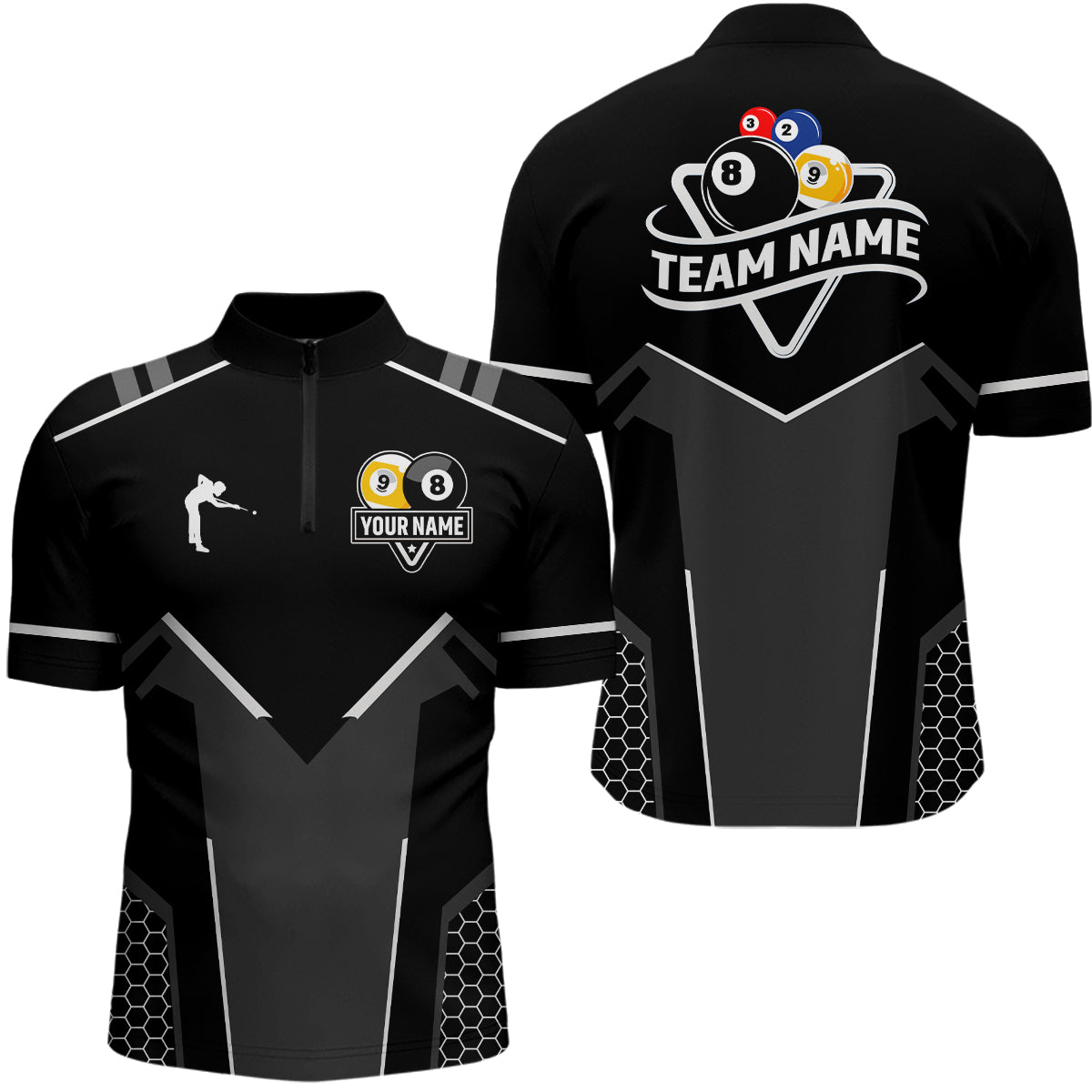 ✔️ Custom Unisex Billiard Shirts Our uniquely designed billiard polo and quarter-zip shirts are ideal for avid poolers who want to make a bold statement. With a stylish form and distinctive design, these shirts set you apart, highlighting your passion and confidence in billiards. Whether you are a professional player or play billiards for fun, we are ready to create great shirts for you and your team. Add your personal touch to create a one-of-a-kind shirt that carries your unique imprint.