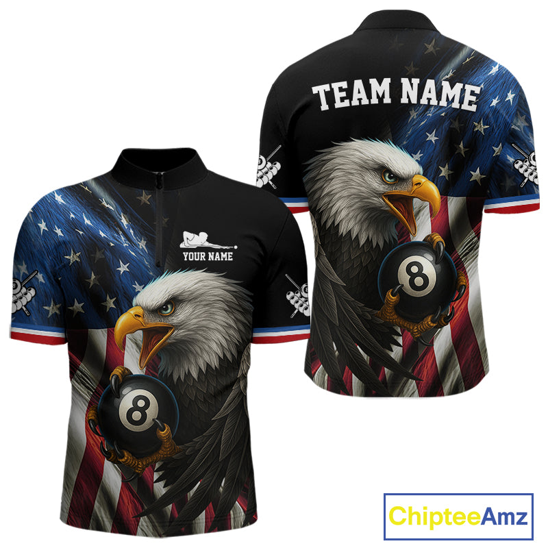 American Flag Eagle 8 Ball Mens Billiard Polo & 1/4 Zip Custom Patriotic Team Billiard Pool Jersey TDM3866