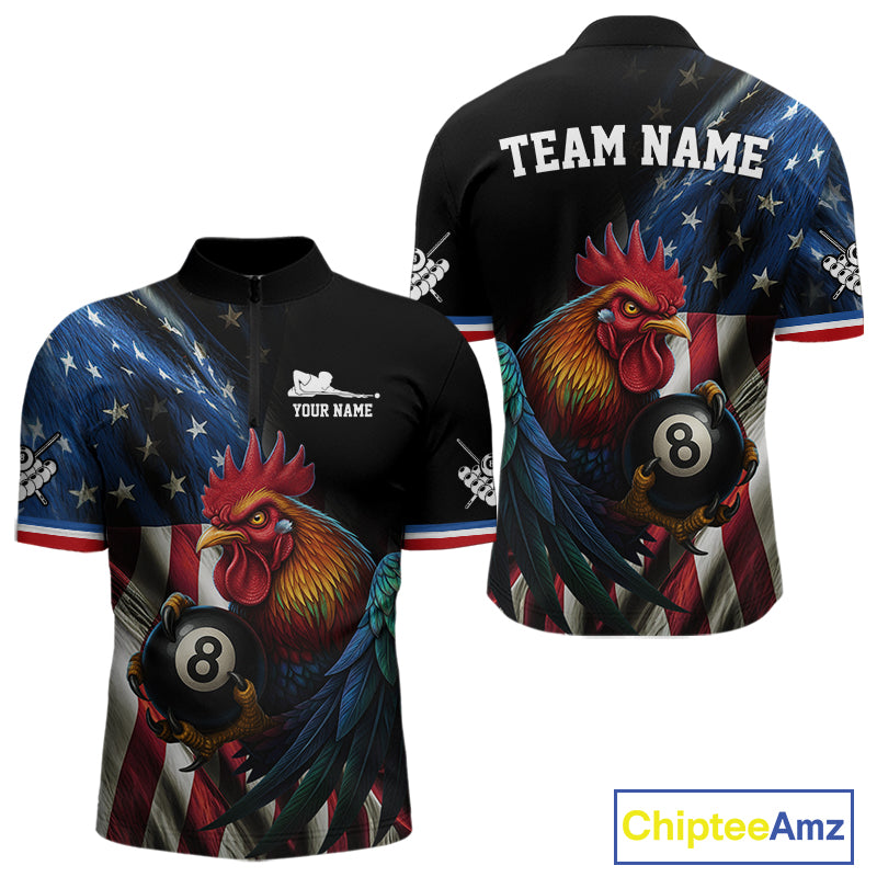American Flag Rooster 8 Ball Men Billiard Polo & 1/4 Zip Custom Patriotic Team Billiard Jersey TDM5238