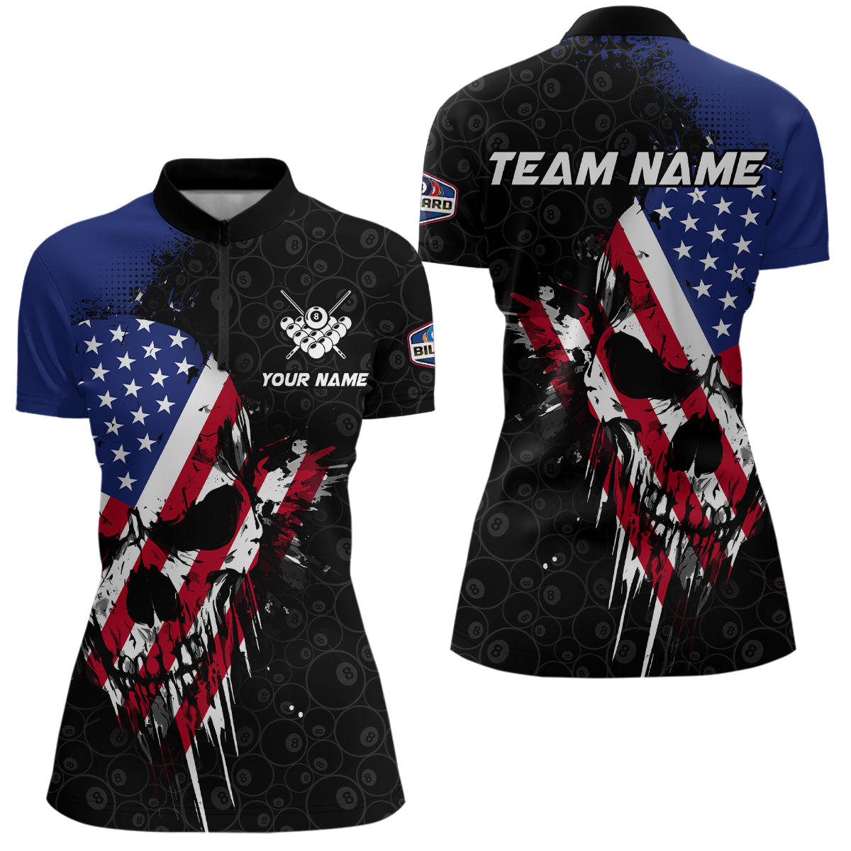 American Flag Grunge Skull 8 Ball Pattern Billiard Shirts For Women Custom Patriotic Billiard Jersey TDM3206
