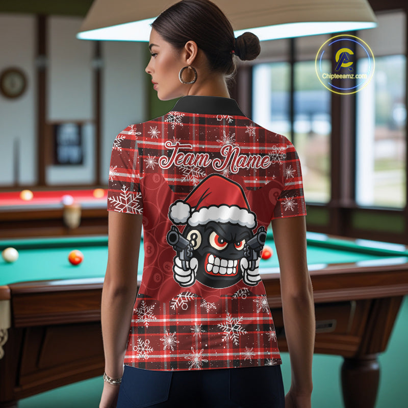 Funny Santa 8 Ball Pool Women's Billiard Shirt Custom Red Plaid Snowflake Christmas Billiard Jersey TDM5223