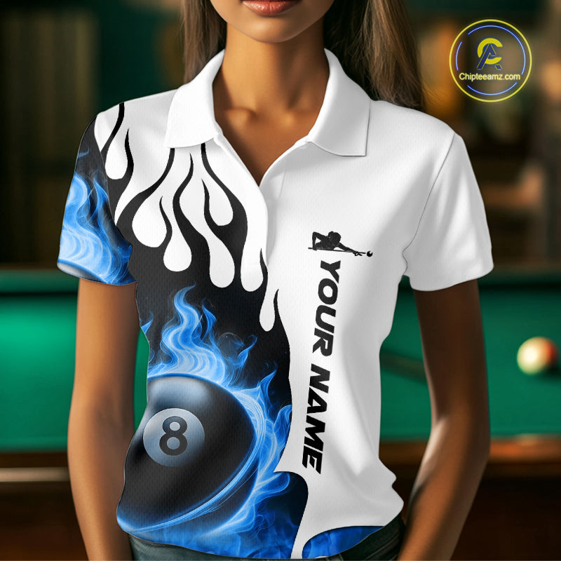 Personalized Blue 8 Ball Fire Flame Women's Billiard Shirt Custom Pool Team Jersey Polo & 1/4 Zip TDM5230