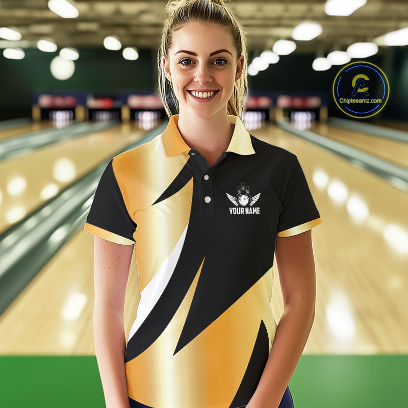 Black and Gold Bowling ball wings Bowling Polo, 1/4 Zip Shirts for Women Custom Bowling Team jersey NQS11043