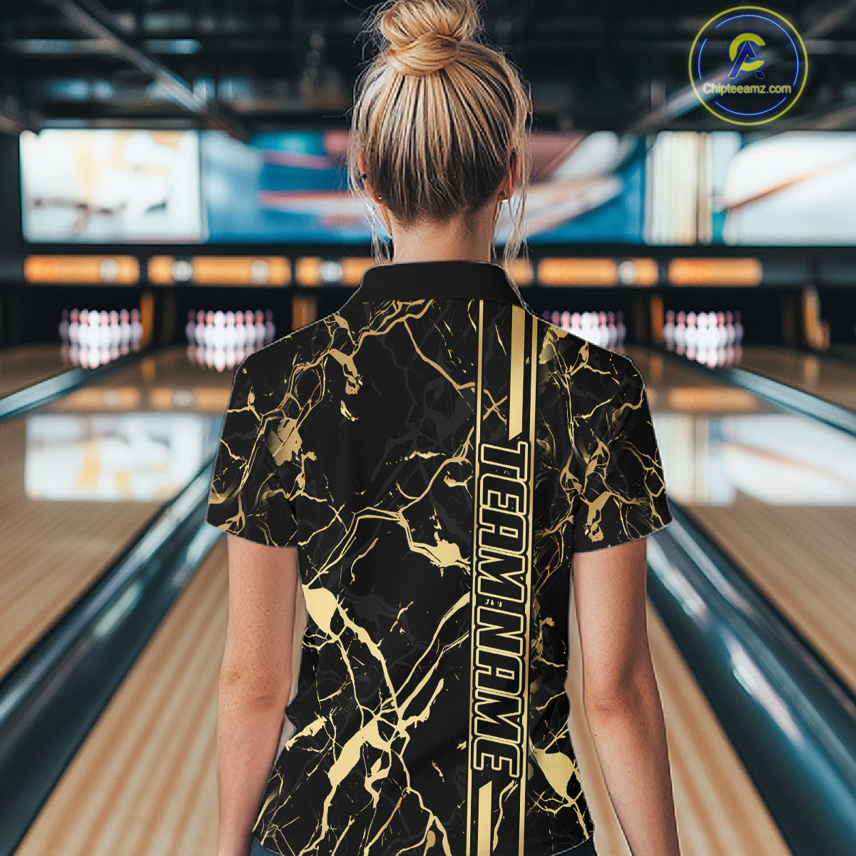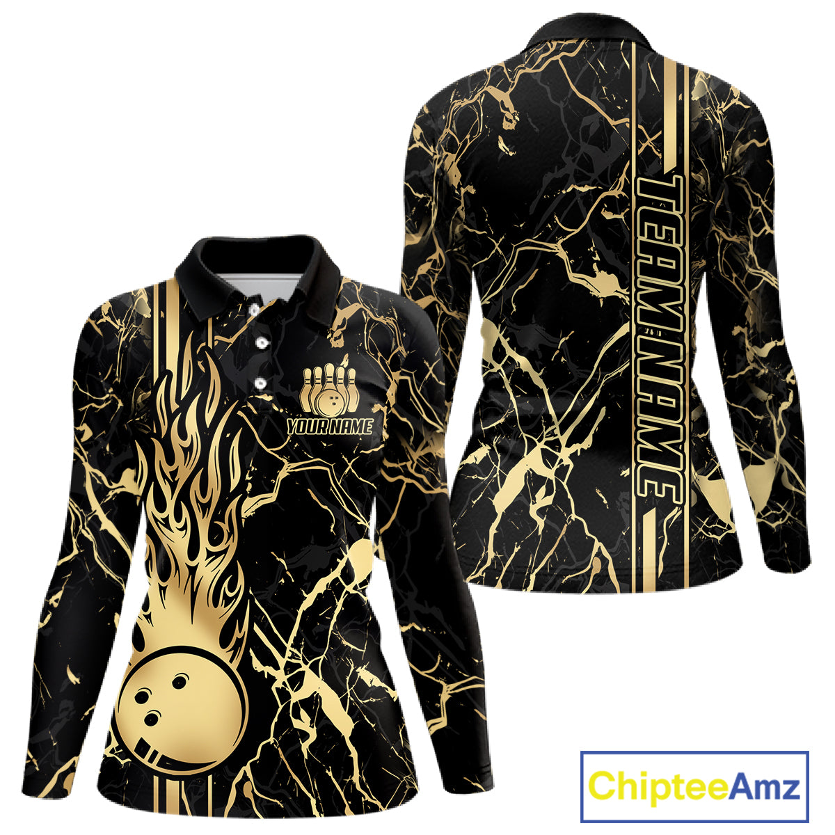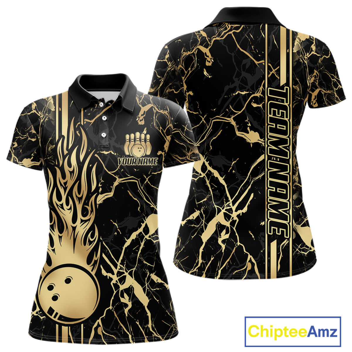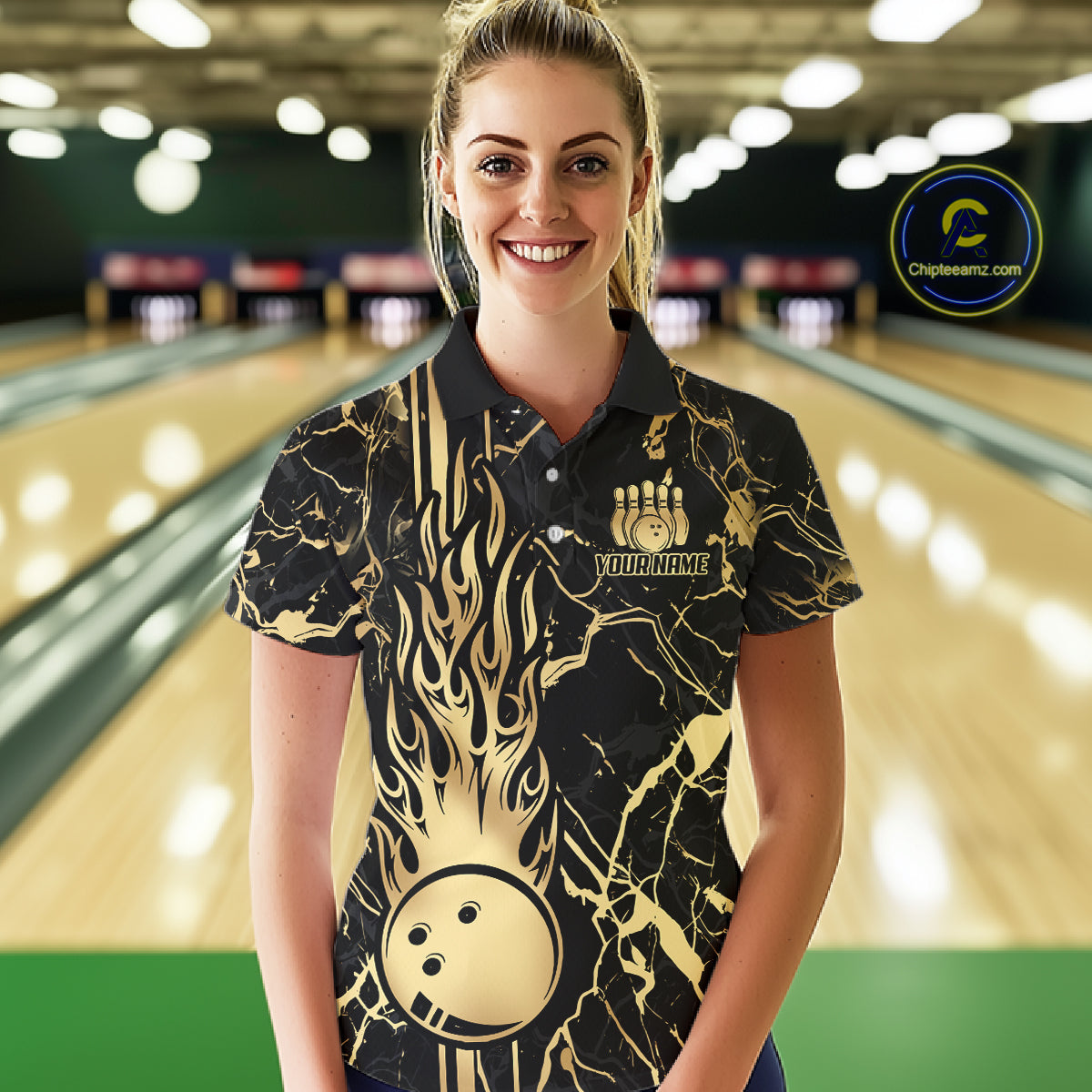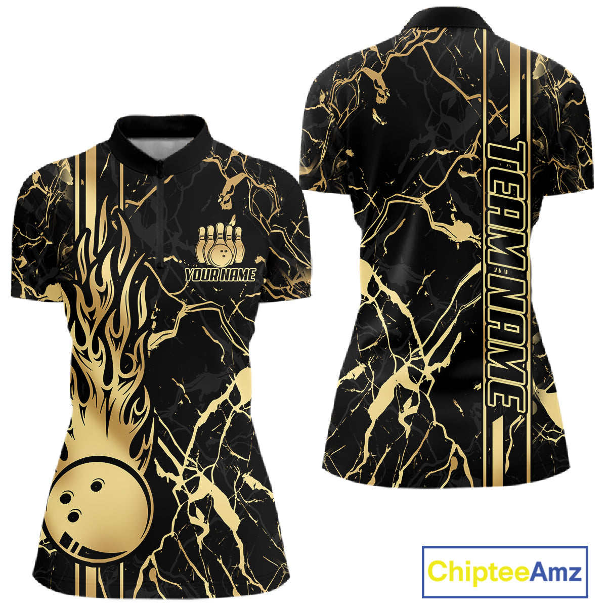 Black and Gold Camo Flame Bowling Polo, Quarter Zip Shirts For Women Custom Team Bowling Jerseys NQS11183