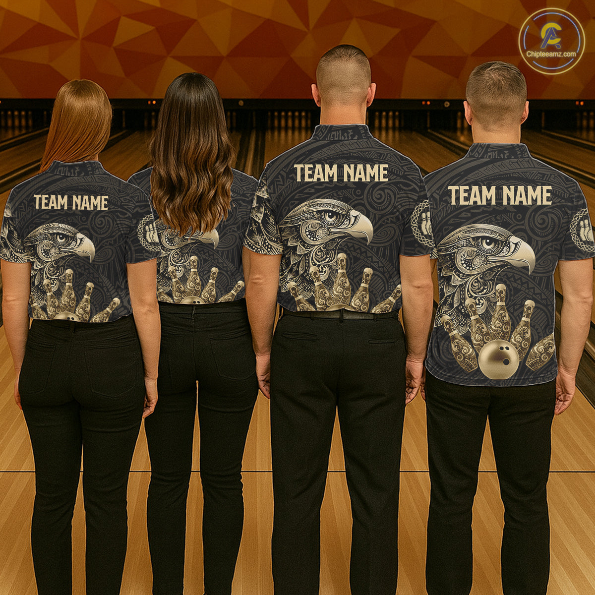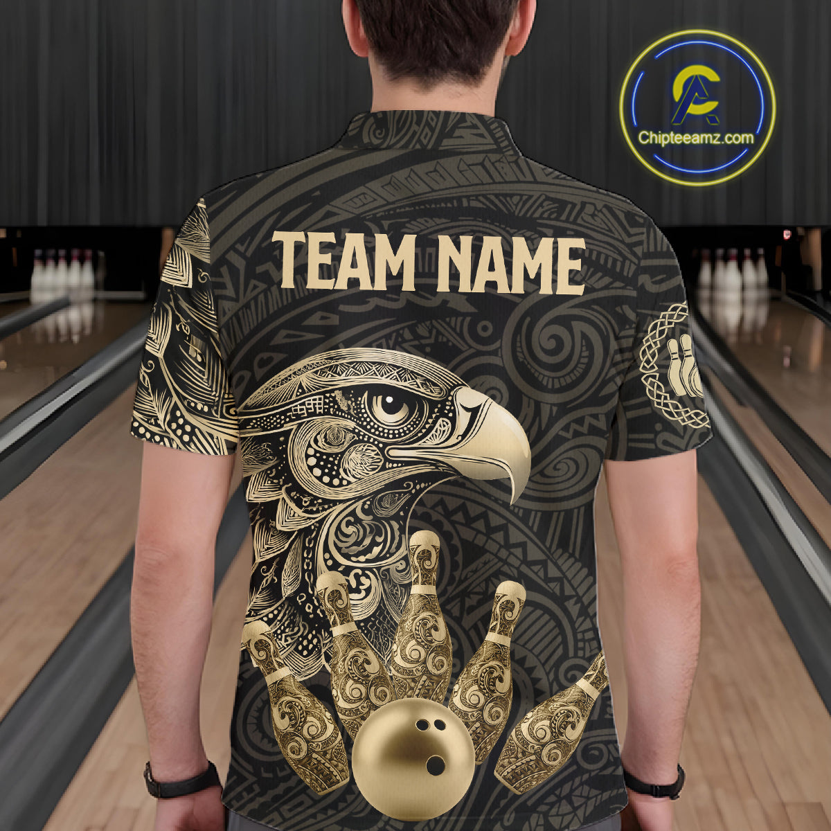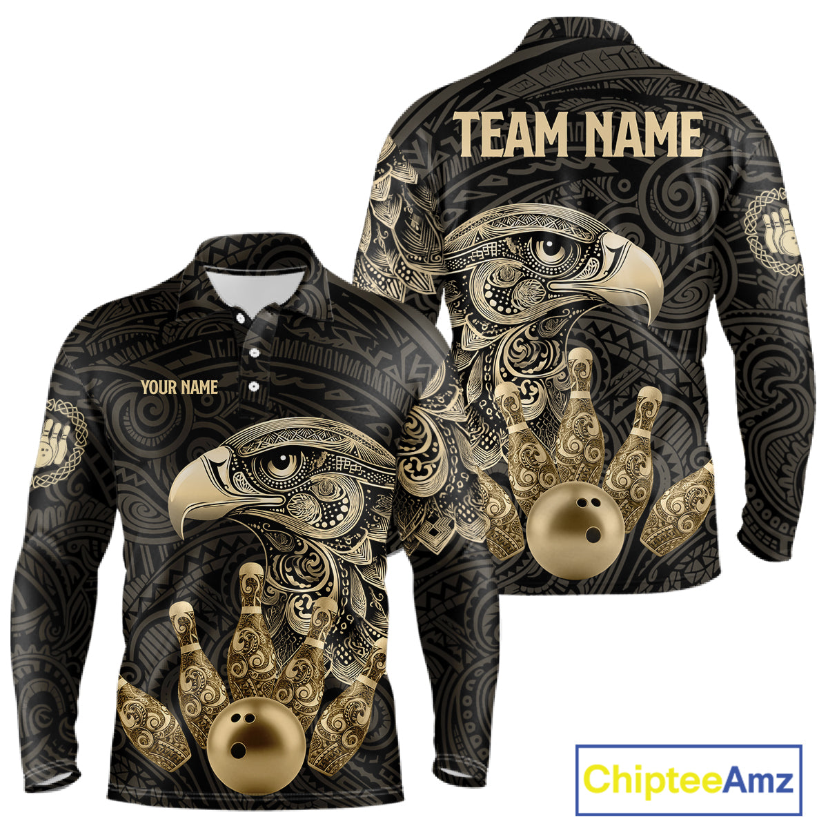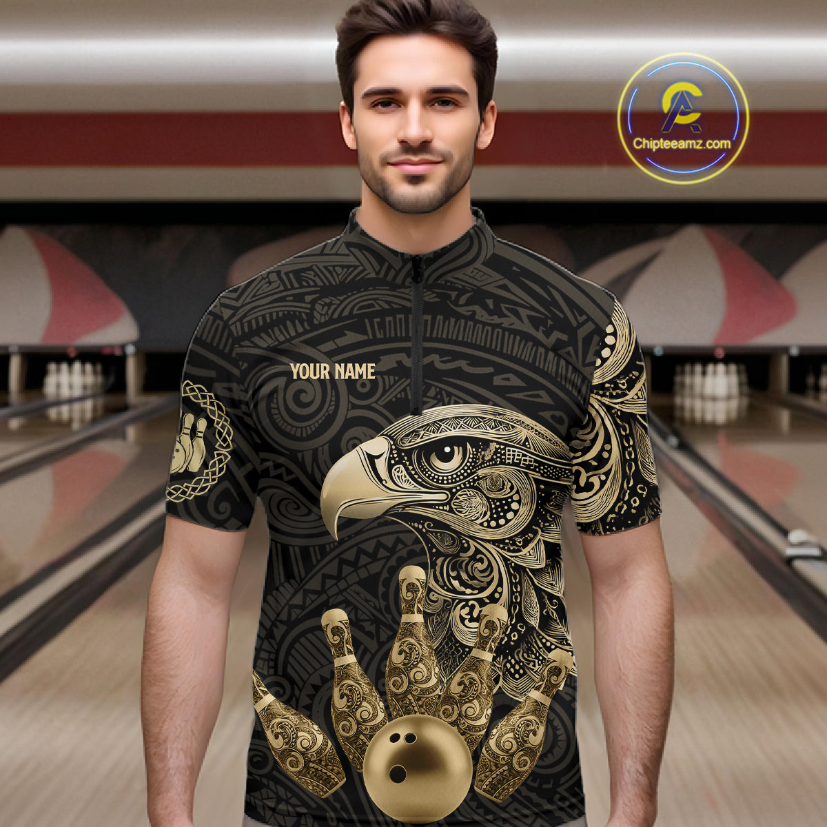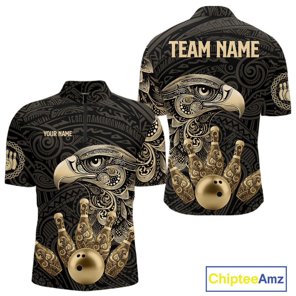 Black and Gold Eagle Tribal Bowling Polo, 1/4 Zip Shirts For Men Custom Retro Bowling Team Jerseys NQS11150