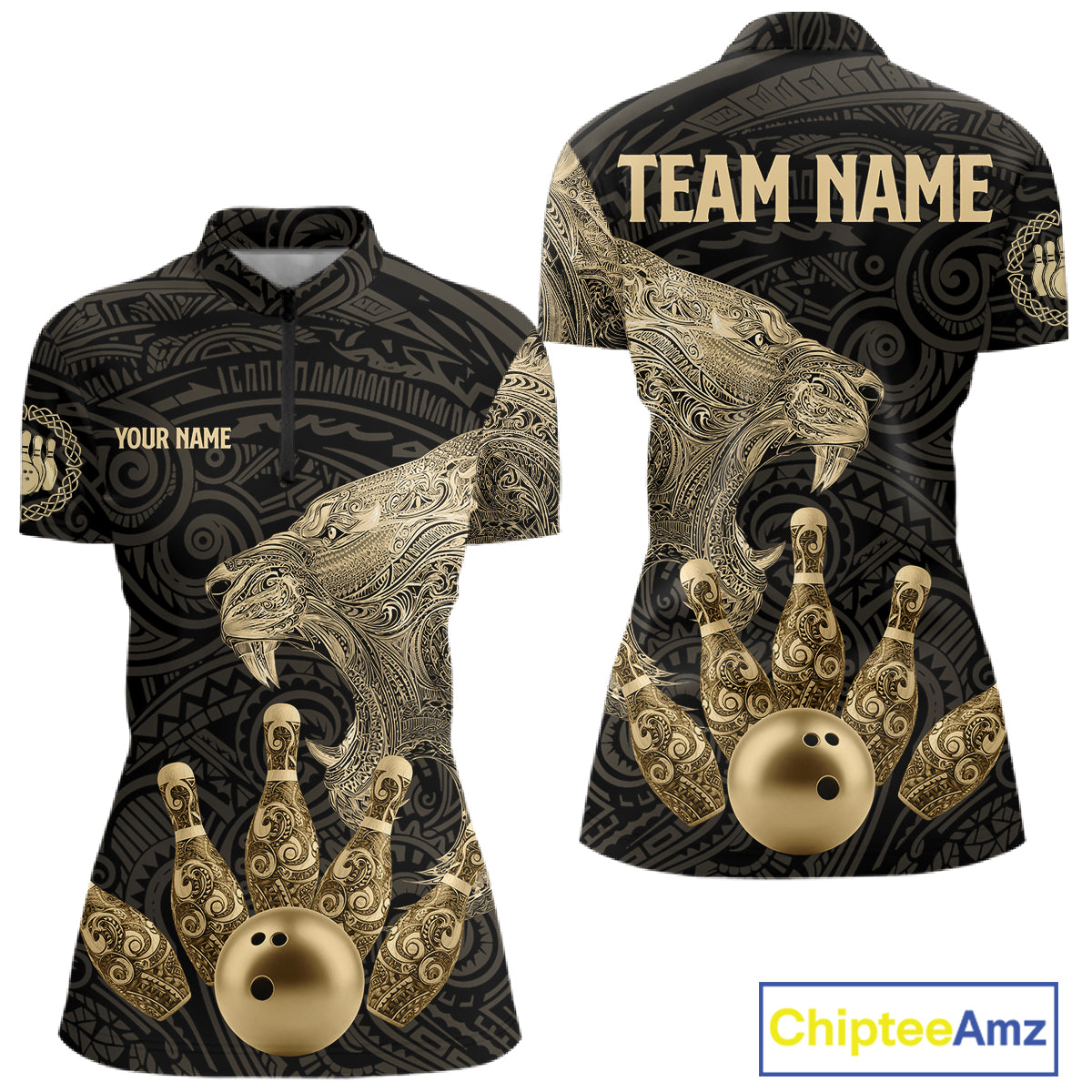 Black and Gold Lion Tribal Bowling Polo, 1/4 Zip Shirts For Women Custom Retro Bowling Team Jerseys NQS11149