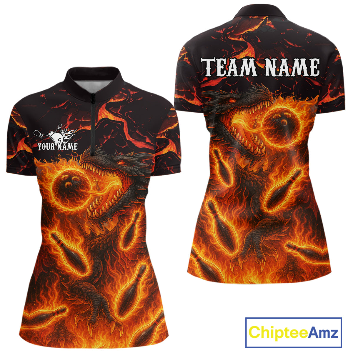 Black And Orange Flame Custom Dragon Bowling Shirts For Women, Dragon Team Bowling League Shirts NQS11071