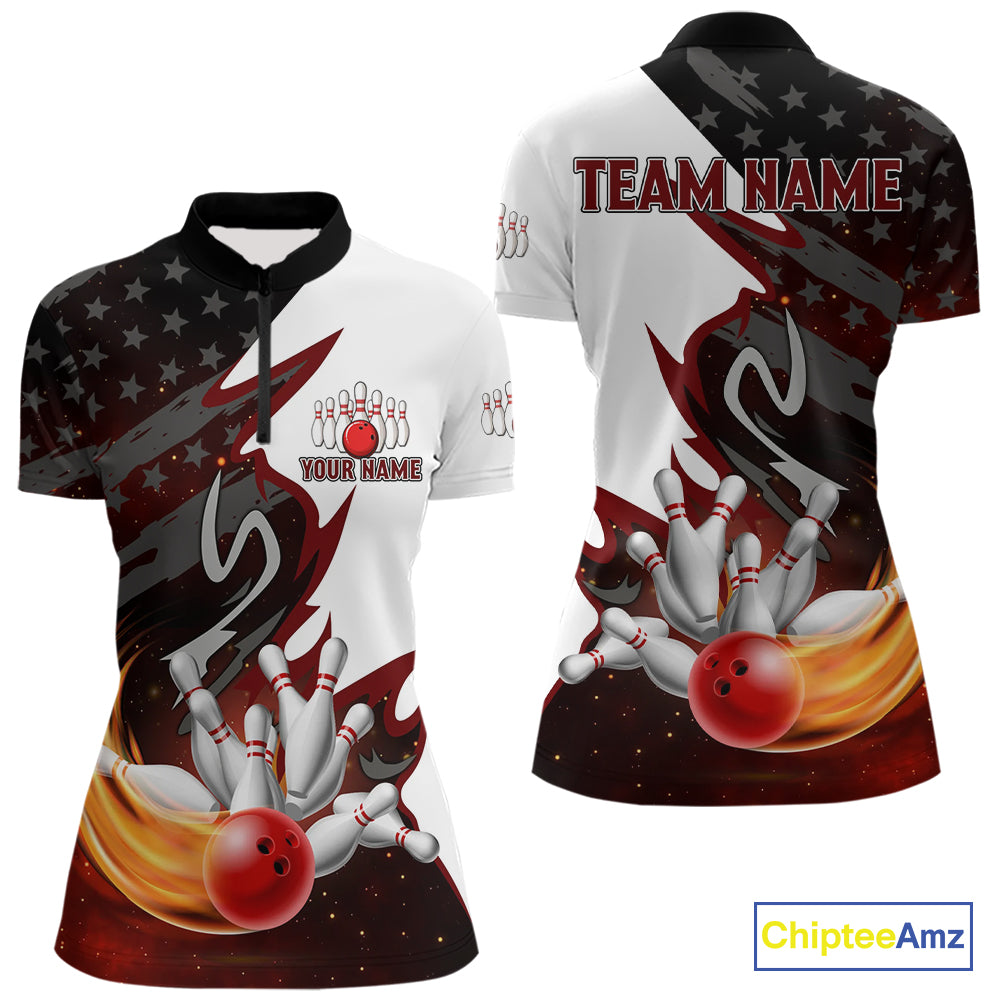 Black and White American flag Bowling jersey Custom Patriotic Bowling Polo, 1/4 Zip Shirts For Women NQS10999