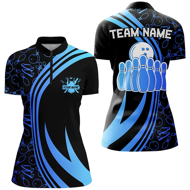 Black Women bowling shirts Custom Blue neon team league bowling jerseys, gifts for bowlers NQS7537