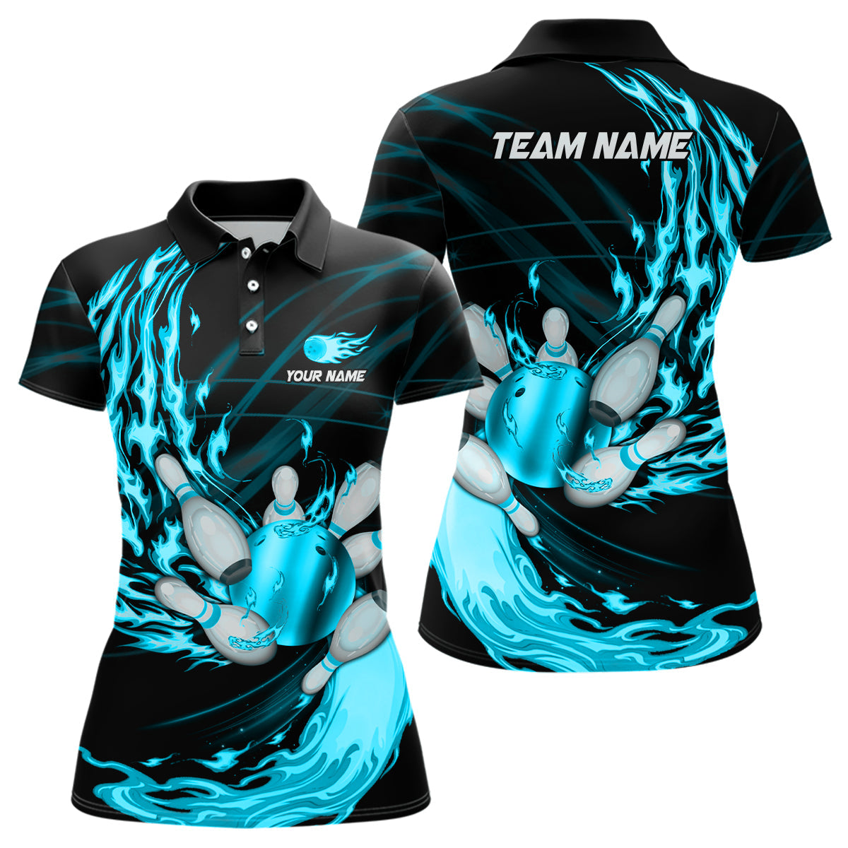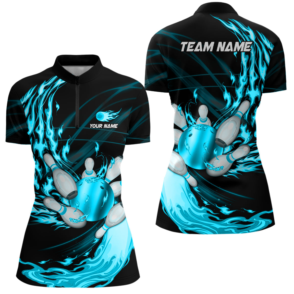 Black Womens bowling shirts Custom Cyan Blue flame Bowling ball and pins Team league bowler Jerseys NQS8486