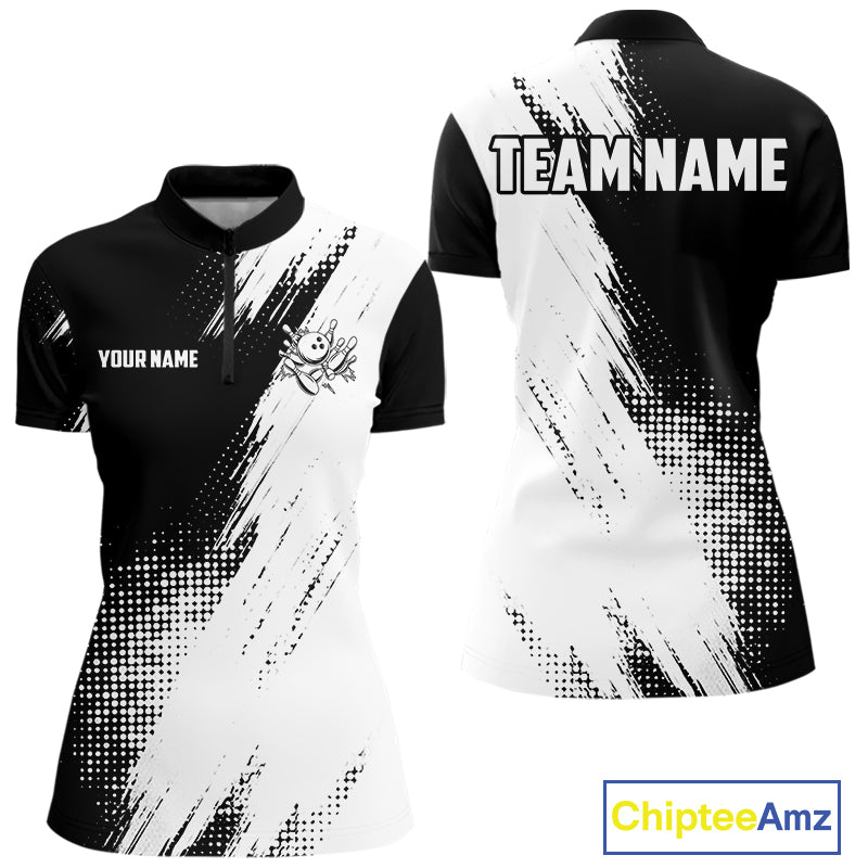 Custom Black and White Strike Bowling Shirts Women Polo, 1/4 Zip Bowling Team Jerseys Bowling League NQS11038
