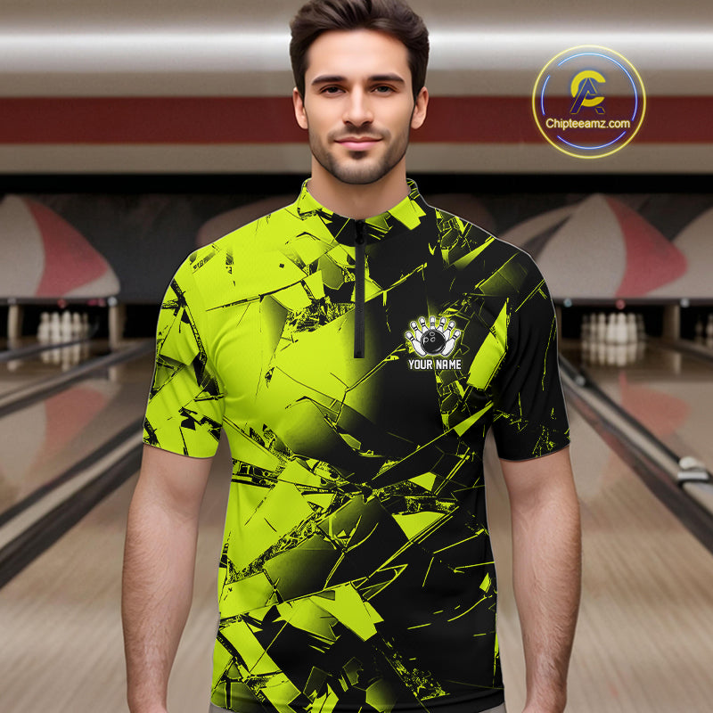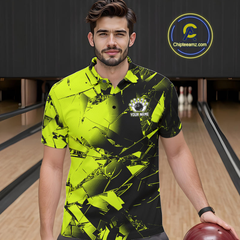 Custom Broken Glass Black and Green Neon Bowling Shirts For Men, Bowling Team League Jerseys NQS11174