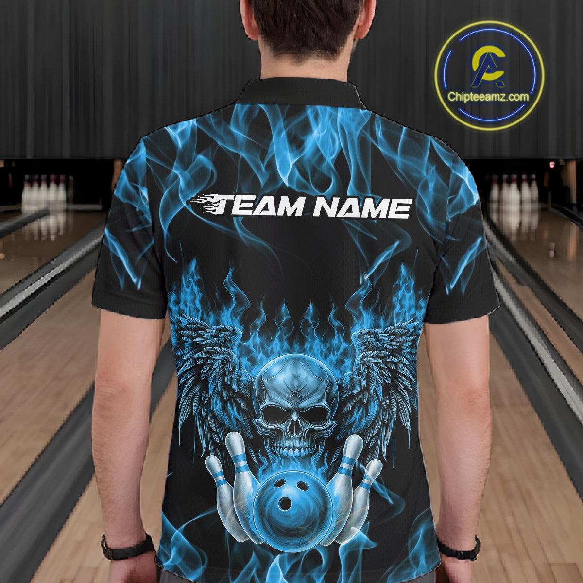 Custom Black And Blue Flame Skull With Wings Men Bowling Shirt, Halloween Team Shirt IPHW10166
