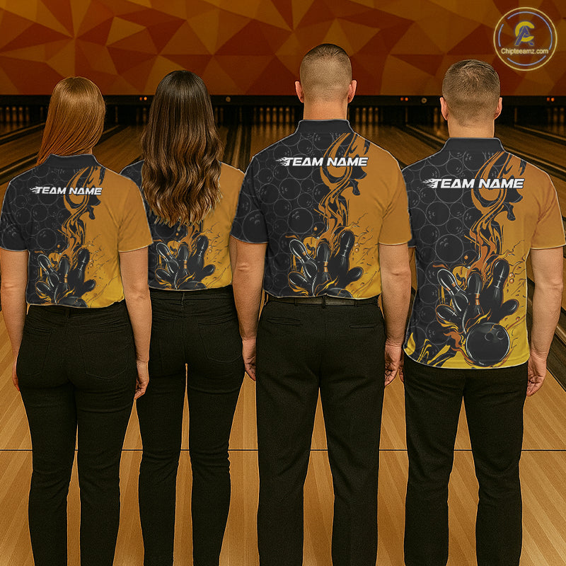 Custom Black And Gold Flame Bowling Team Men Polo Shirts, Yellow Bowling League Shirt IPHW10188