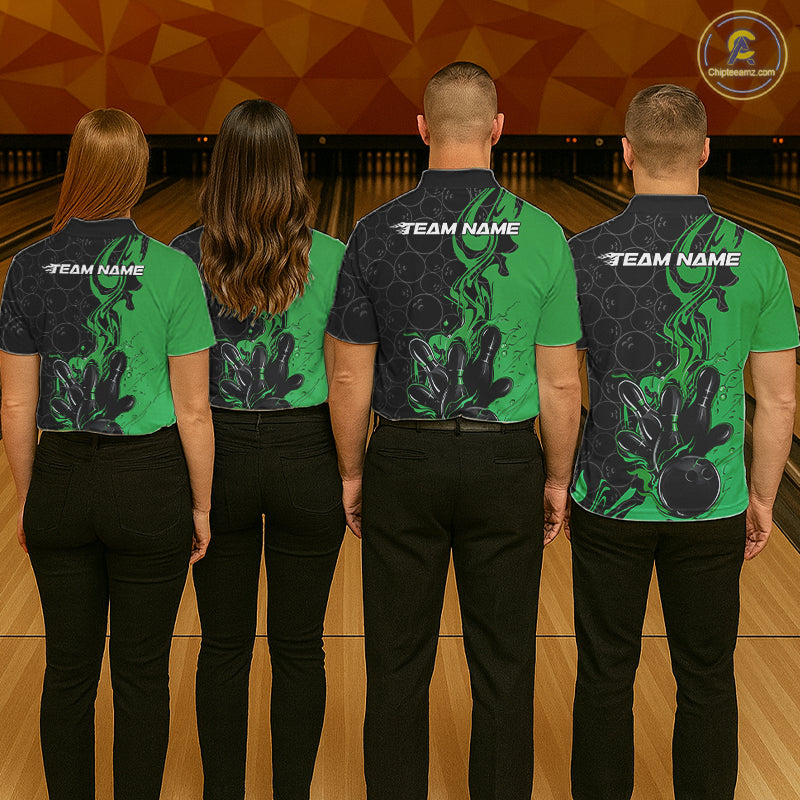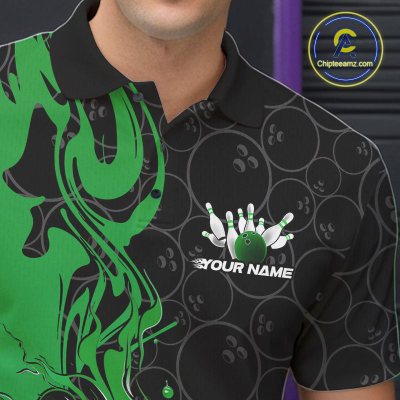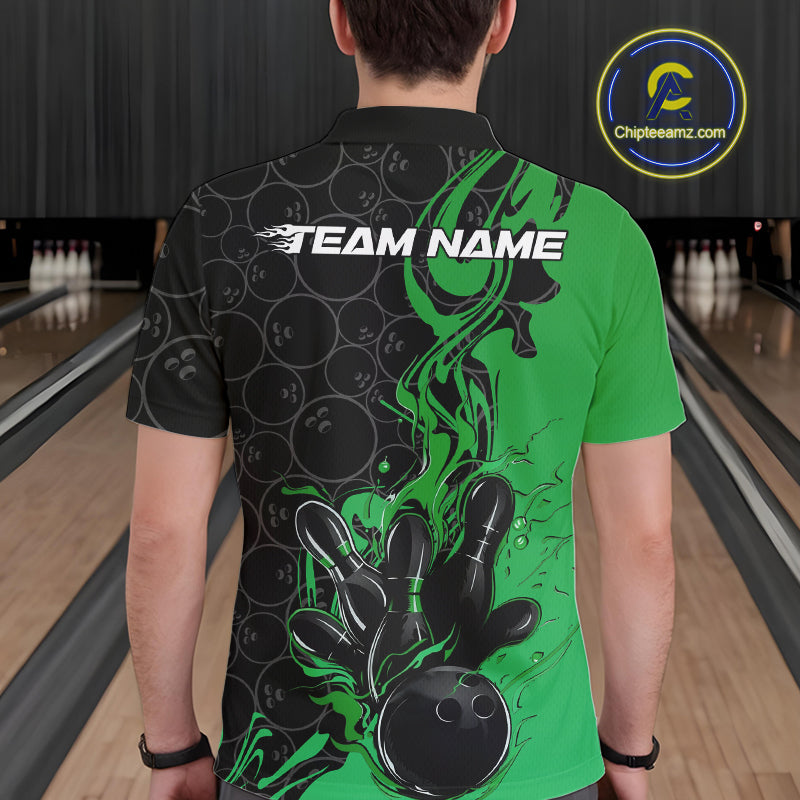 Custom Black And Green Flame Bowling Team Men Polo Shirts, Bowling League Shirt IPHW10189