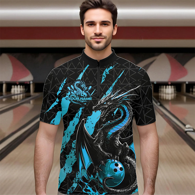 Custom Black And Blue Dragon Bowling Team Quarter-Zip Shirts For Men, Dragon Bowling Jerseys IPHW8925