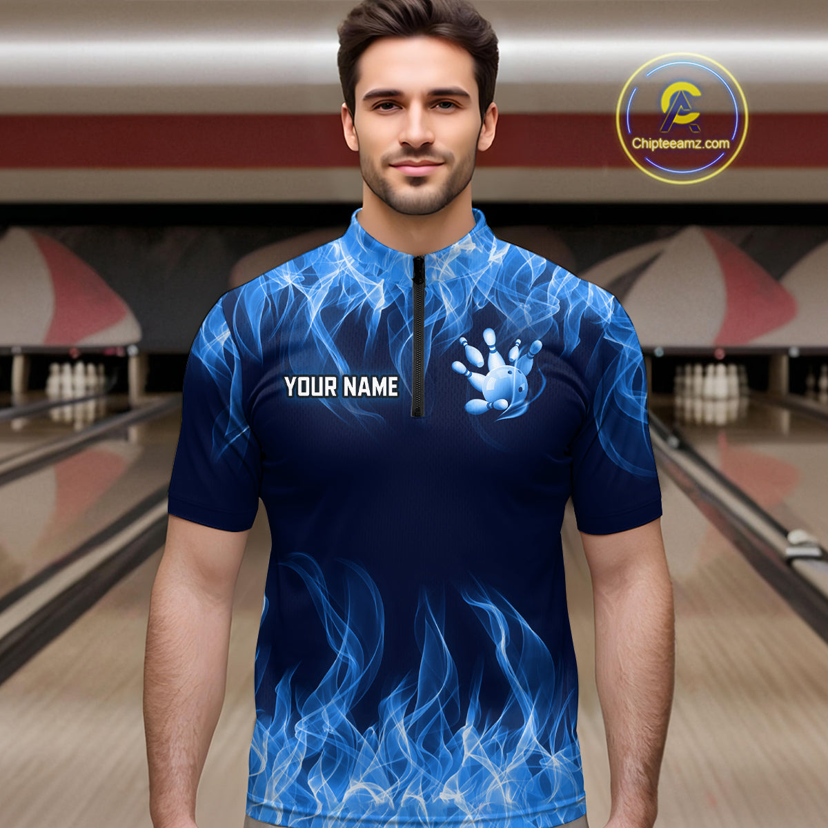 Custom Blue Flame Bowling Jersey for Men Bowling Uniform Polo & 1/4 Zip Bowling Team Shirts HNT106