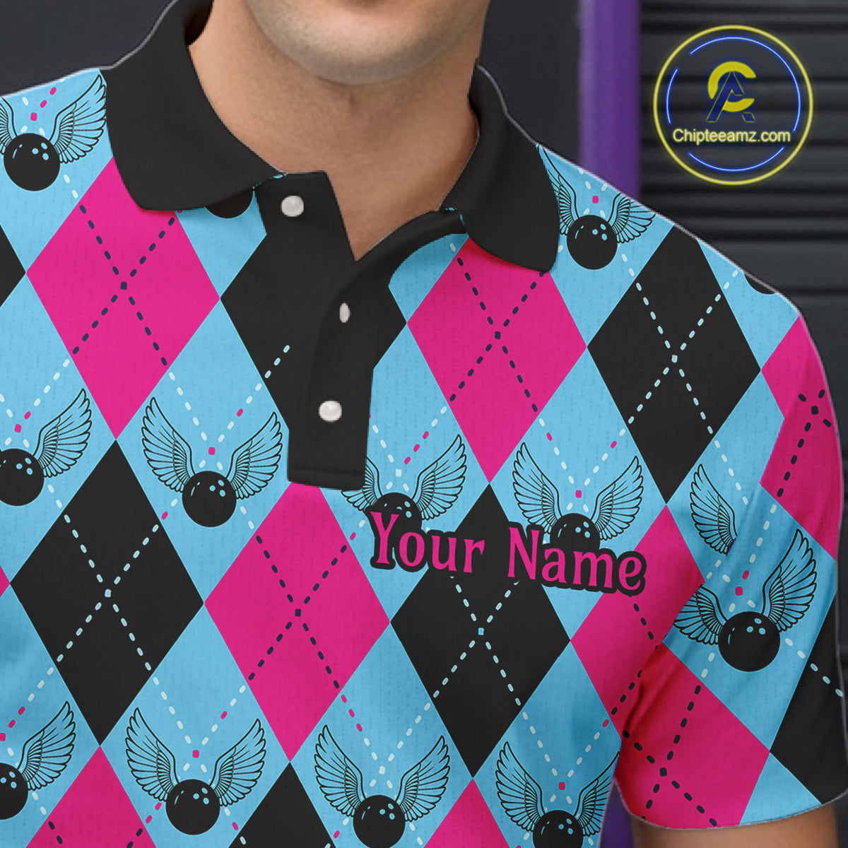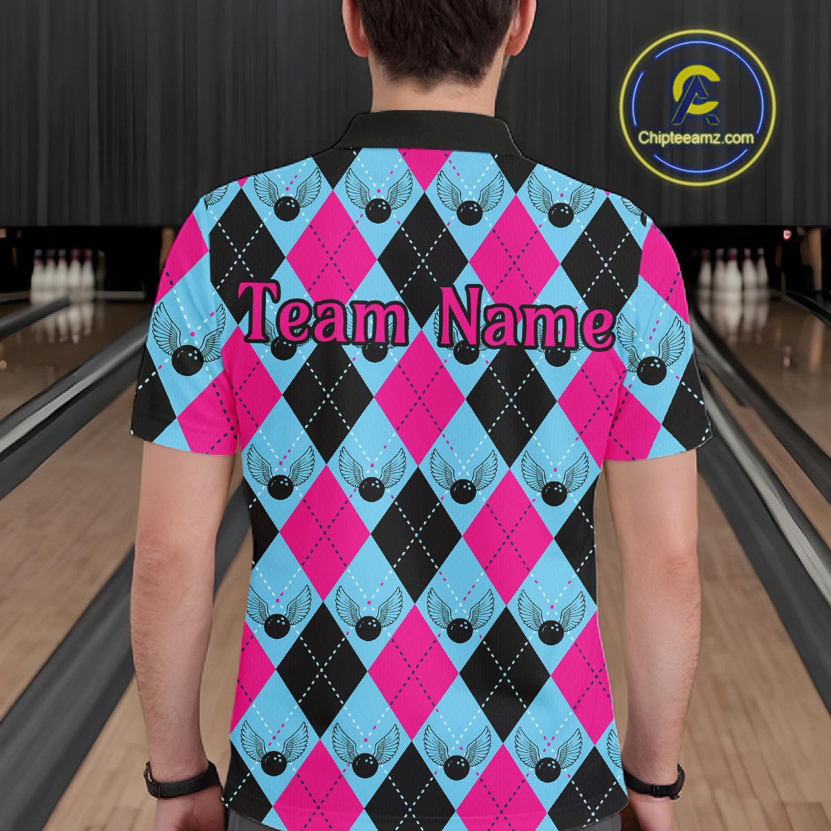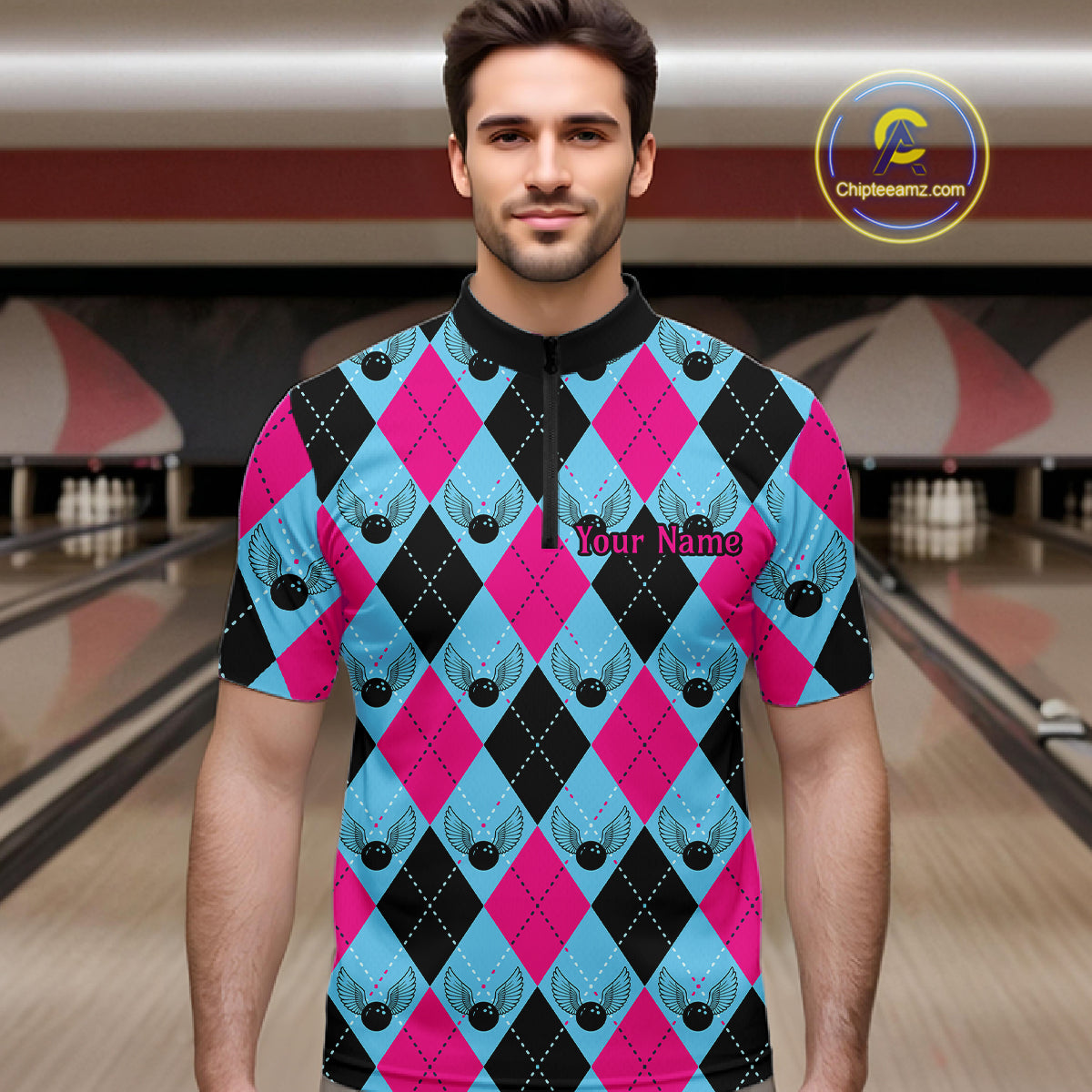 Blue And Pink Argyle Pattern Custom Bowling Shirts For Men, Personalized Bowling Team Shirt IPHW7306