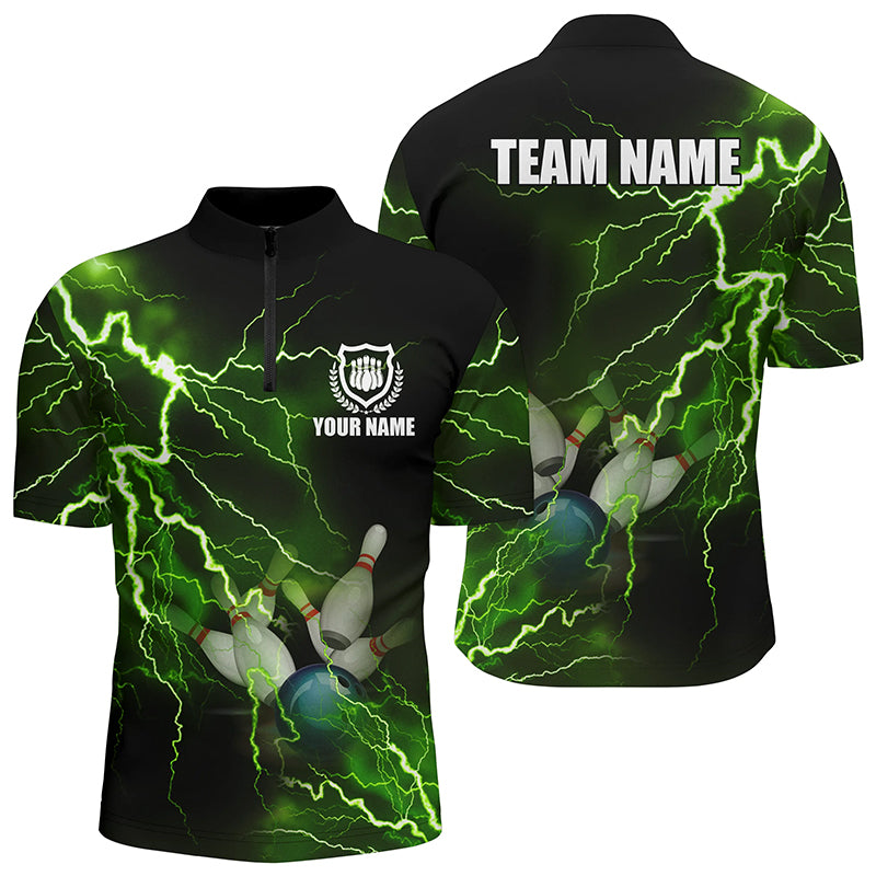 Men's bowling Quarter Zip shirts Custom green lightning thunder Bowling Team Jersey, gift for Bowlers NQS6146