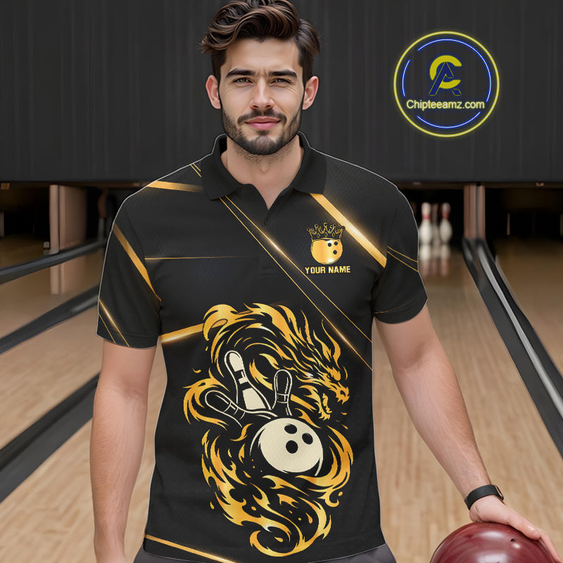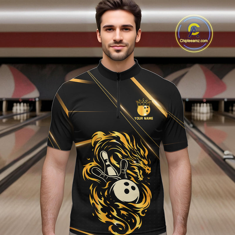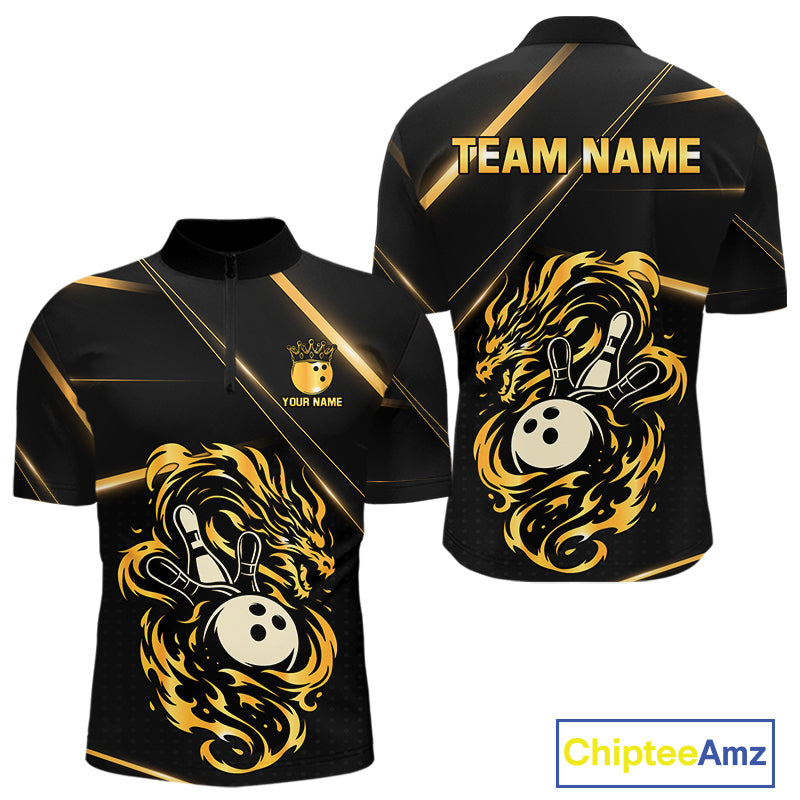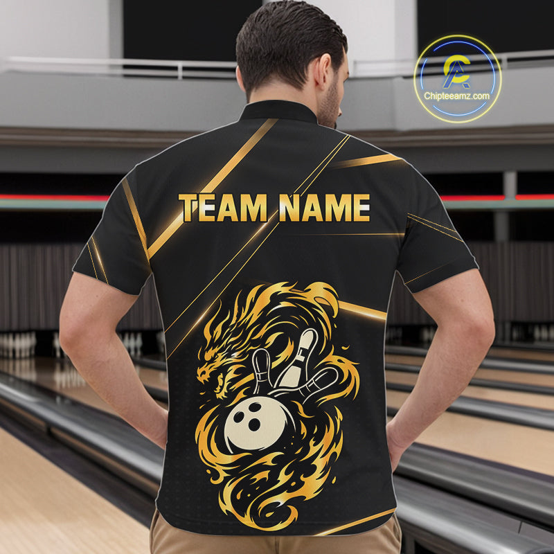 Black and Gold Flame Dragon Bowling Polo, Quarter Zip Shirt for Men Custom Bowling Team League Jersey NQS10904