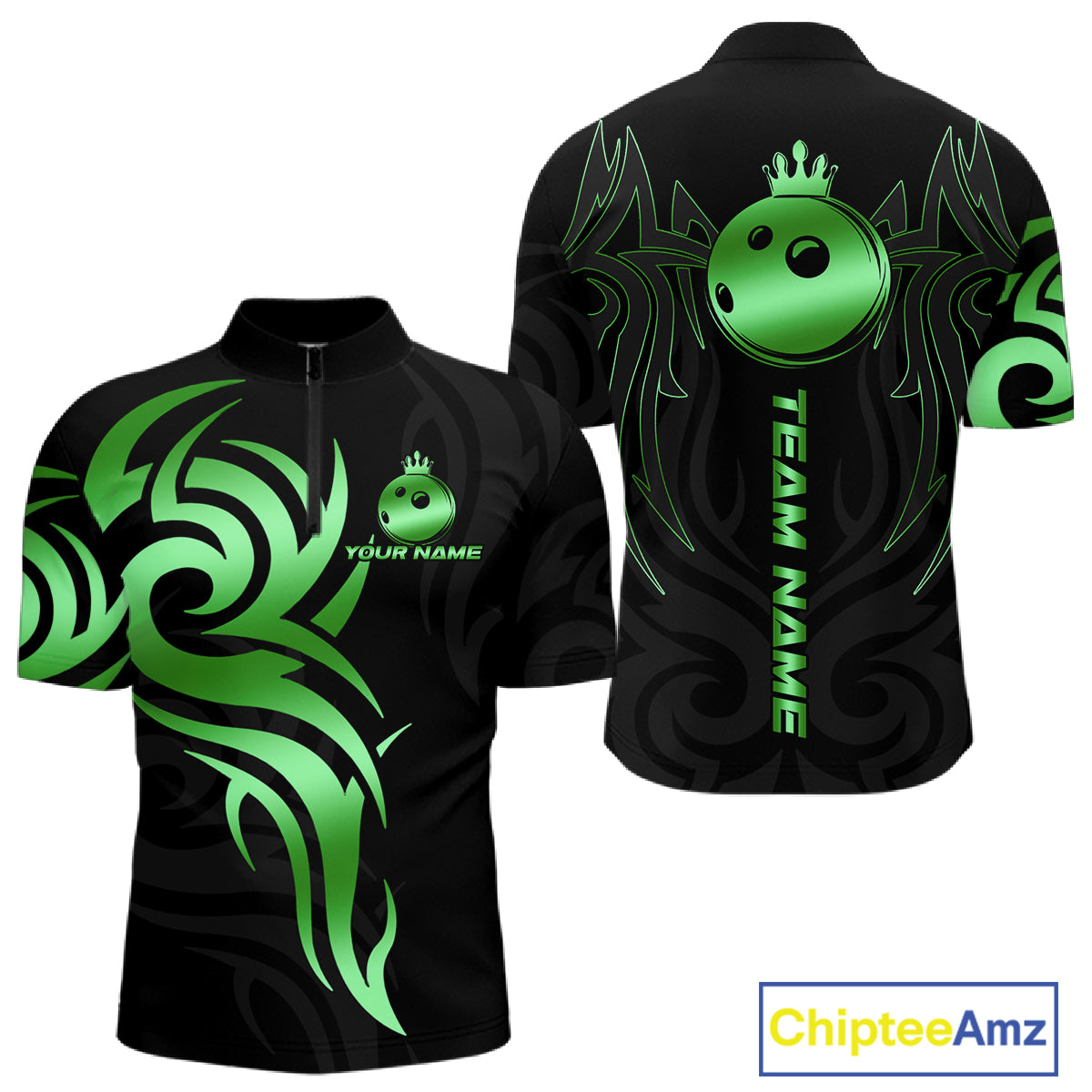 Black and Green crown Bowling ball Polo, Quarter Zip Shirts for Men Custom Bowling Team jerseys NQS10731