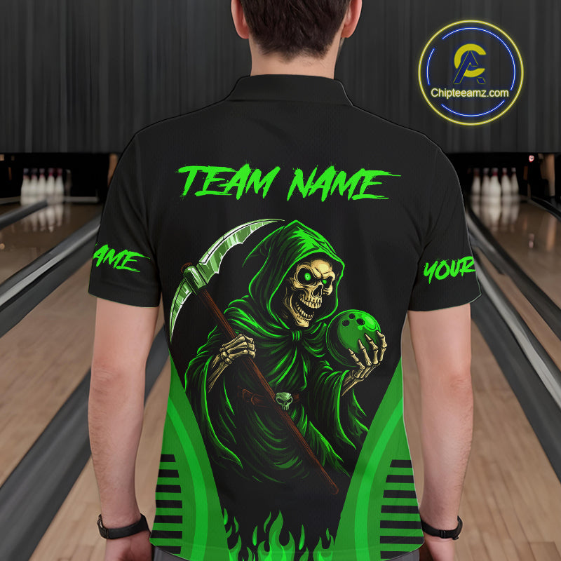 Black and Green Flame Skull Reaper Bowling Polo, Quarter Zip shirt for Men Custom team bowling jersey NQS10712