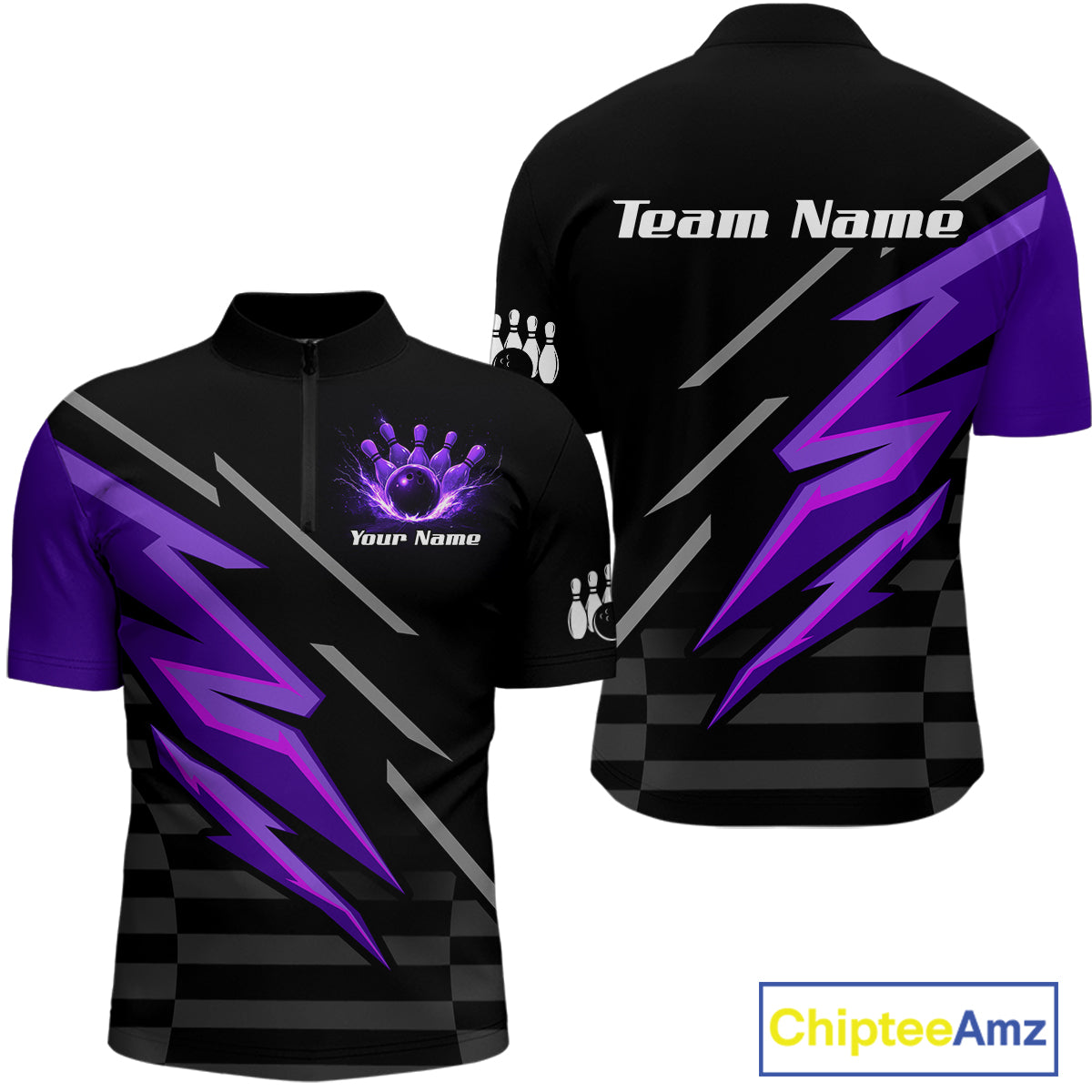 Black and Purple Lightning Bowling Polo, Quarter Zip Shirt for Men Custom Bowling Team League Jersey NQS10907